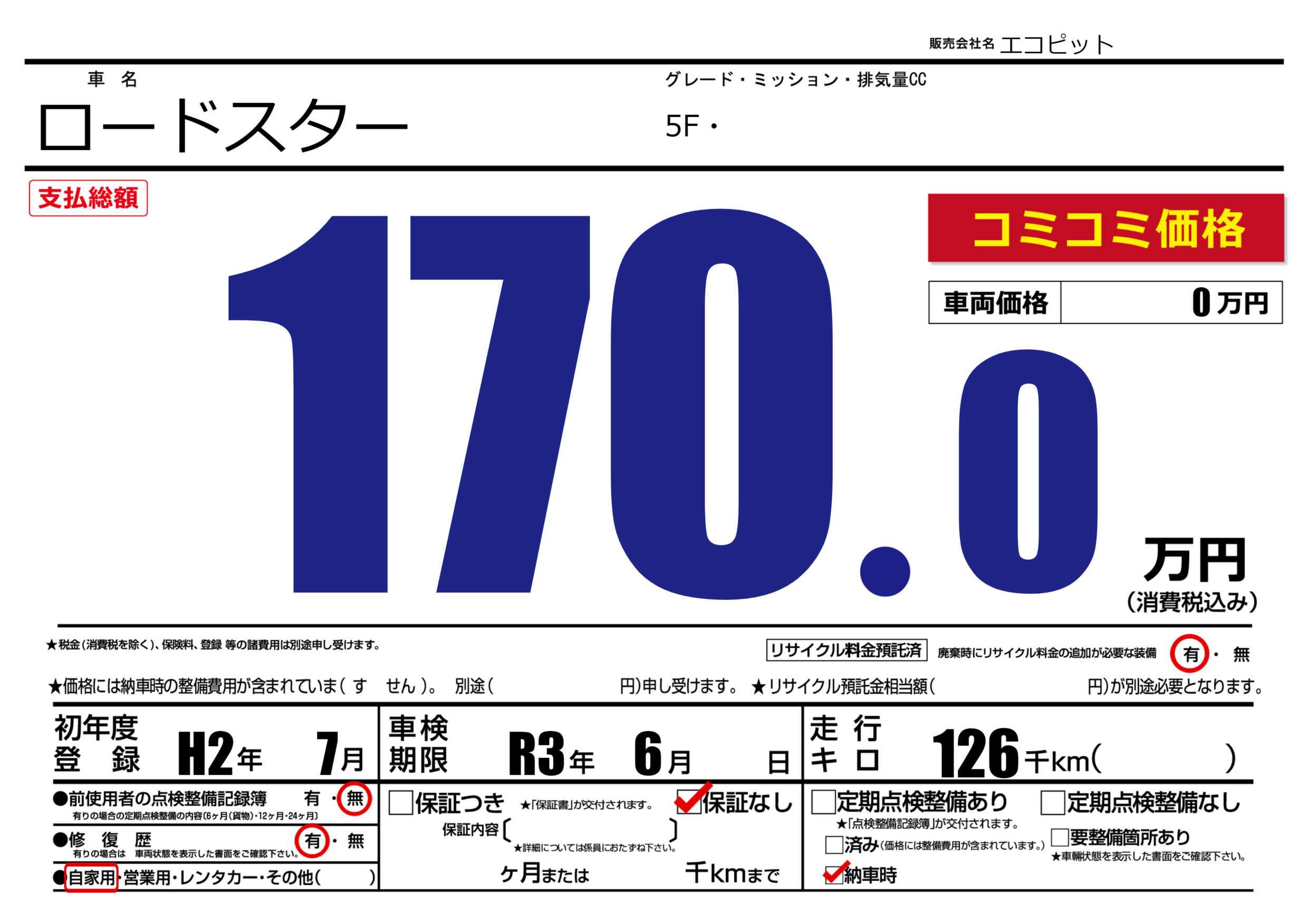 | 走行キロ | 12.6万km | 初年度登録 | H2年7月 |