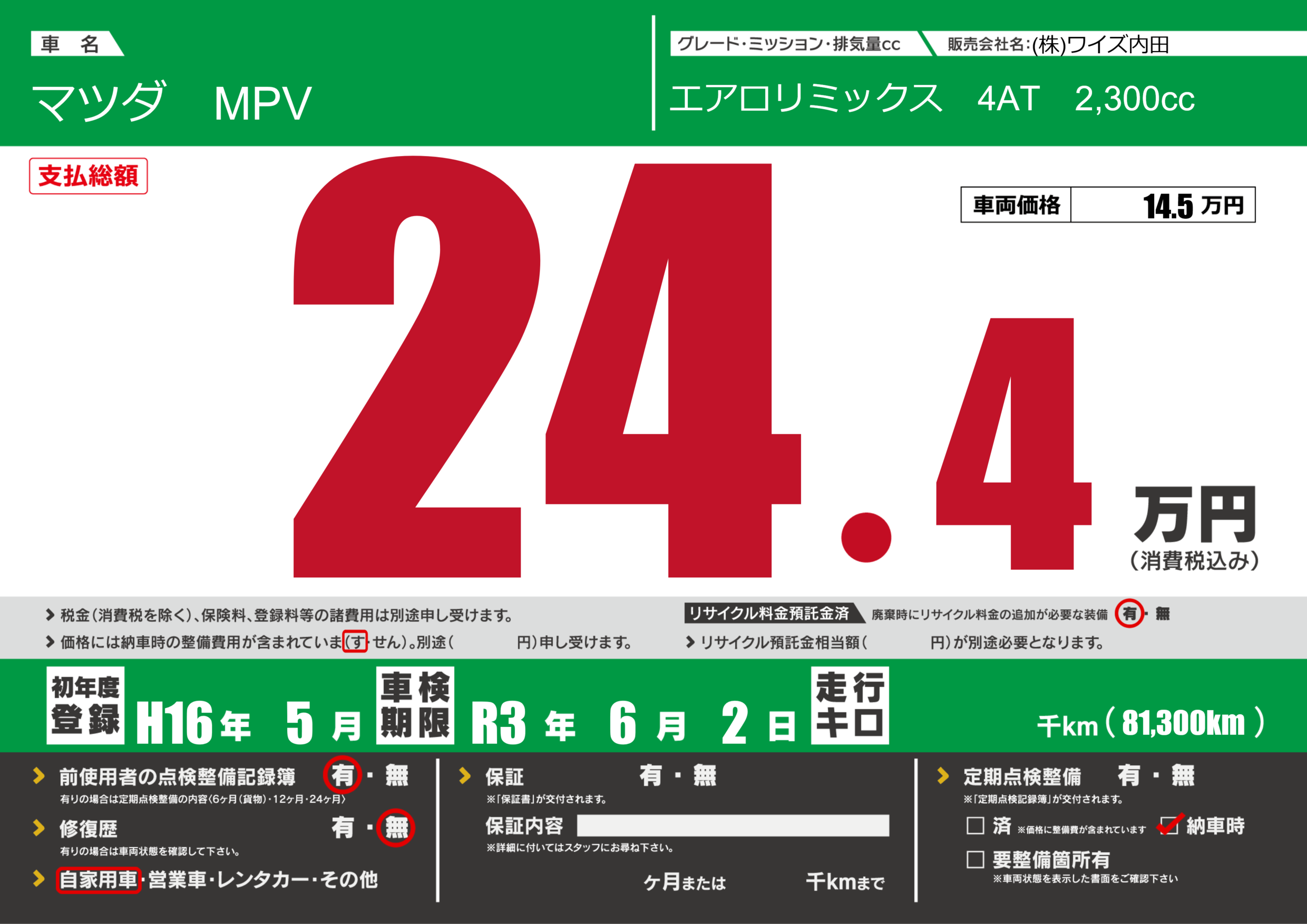 定期点検整備 納車時あり