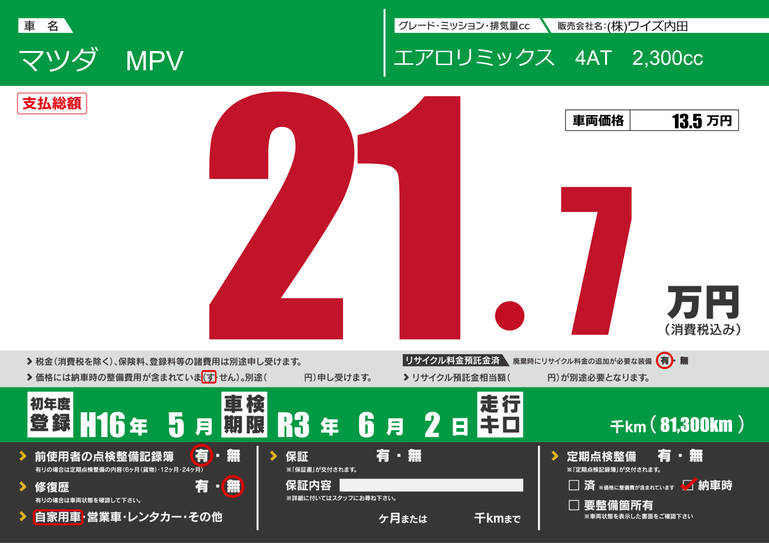 定期点検整備 納車時あり