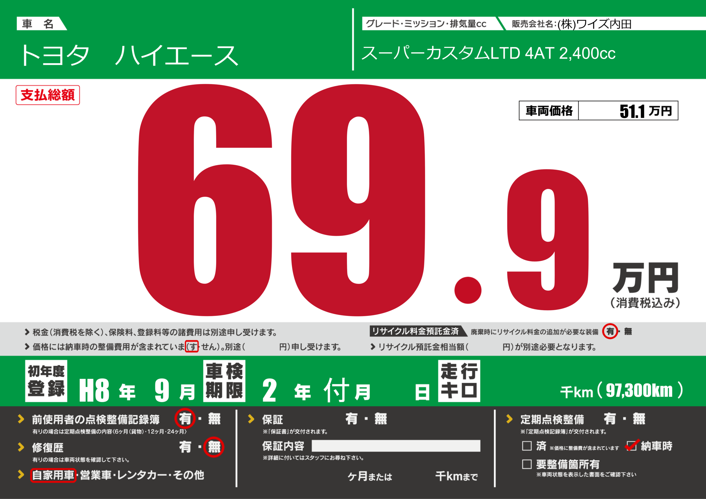 | 走行キロ | - | 初年度登録 | H8年9月 |