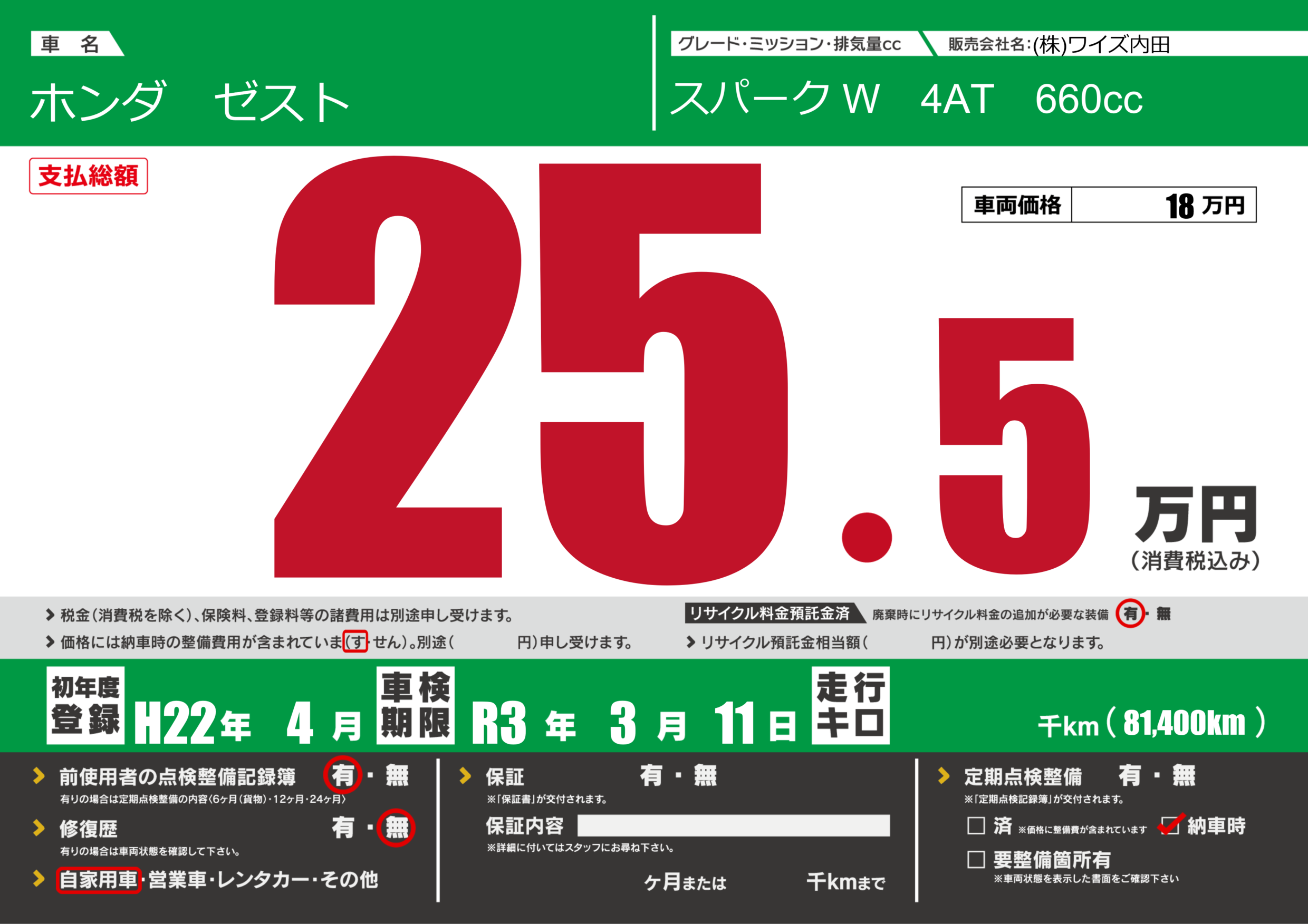 | 走行キロ | - | 初年度登録 | H22年4月 |