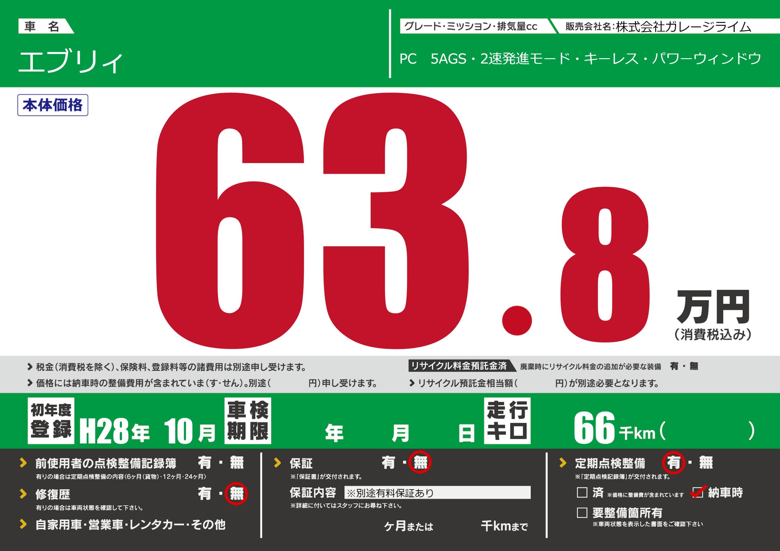 | 定期点検整備 | 定期点検整備あり 納車時あり | ||