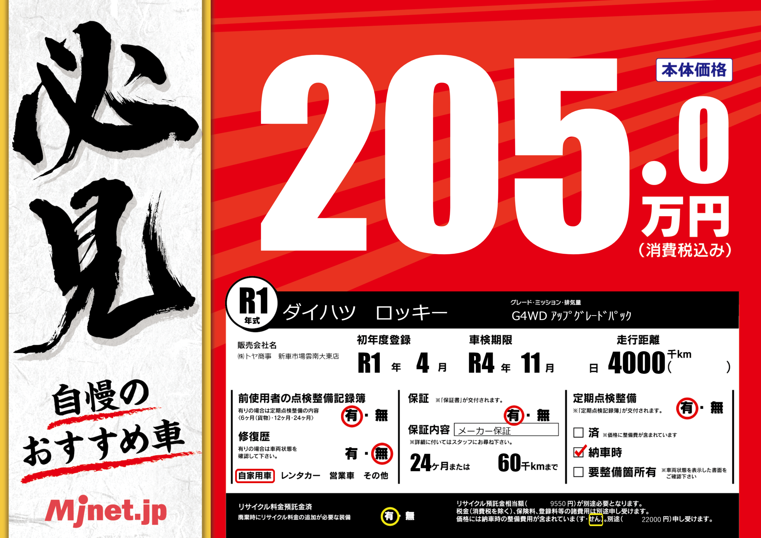 | 車名 | ダイハツ ロッキー | グレード ミッション 排気量 |