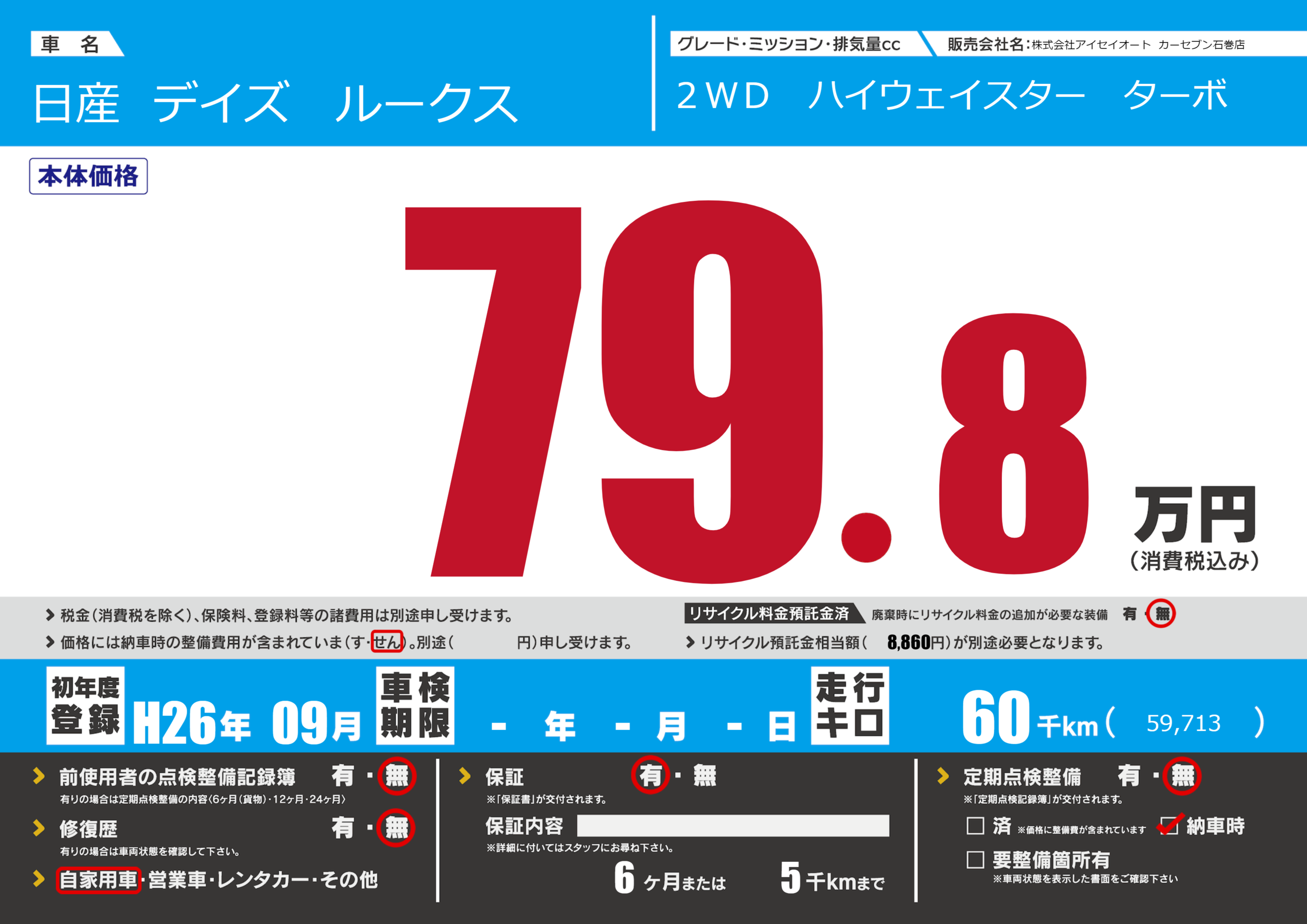 | 車名 | 日産 デイズ ルークス | グレード ミッション 排気量 |