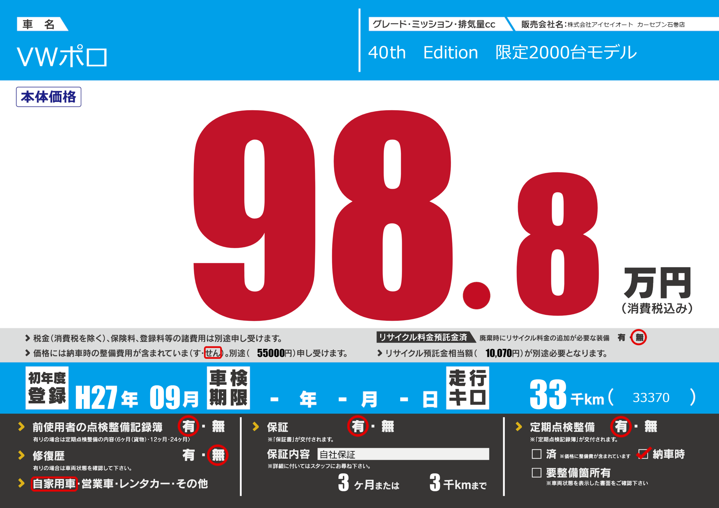 | 車名 | VWポロ | グレード ミッション 排気量 |