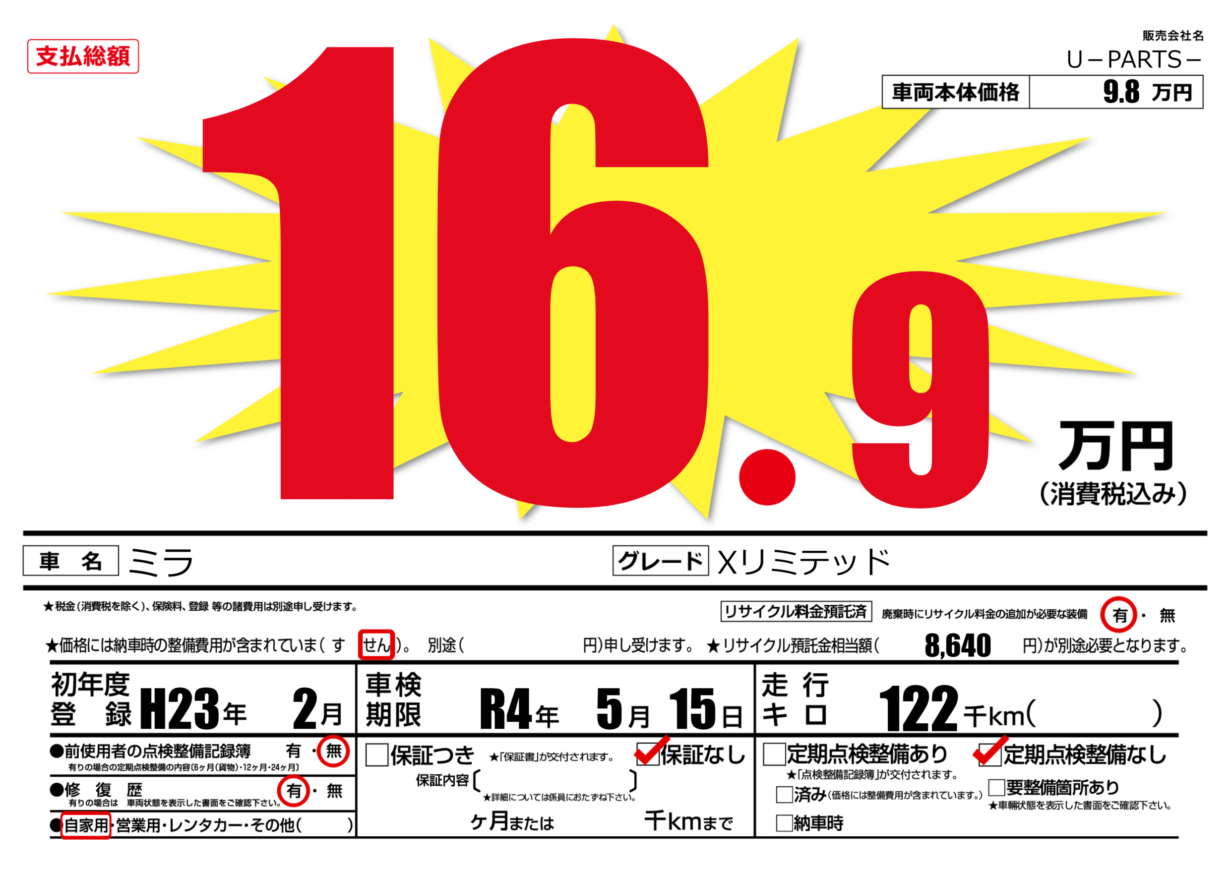 あり | リサイクル預託金相当額 | ( 1円)が別途必要 |