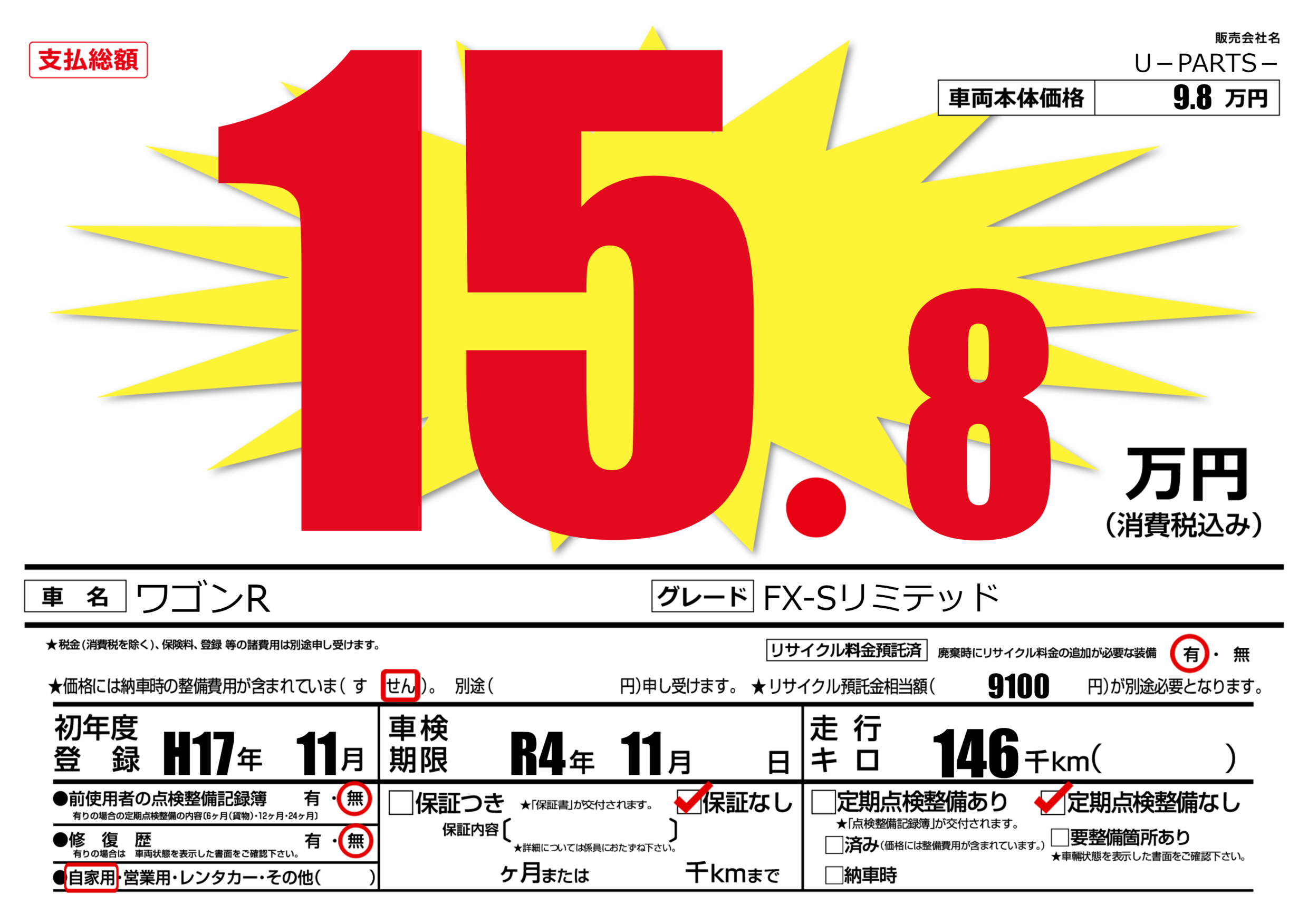 | 走行キロ | 14.6万km | 初年度登録 | H17年11月 |