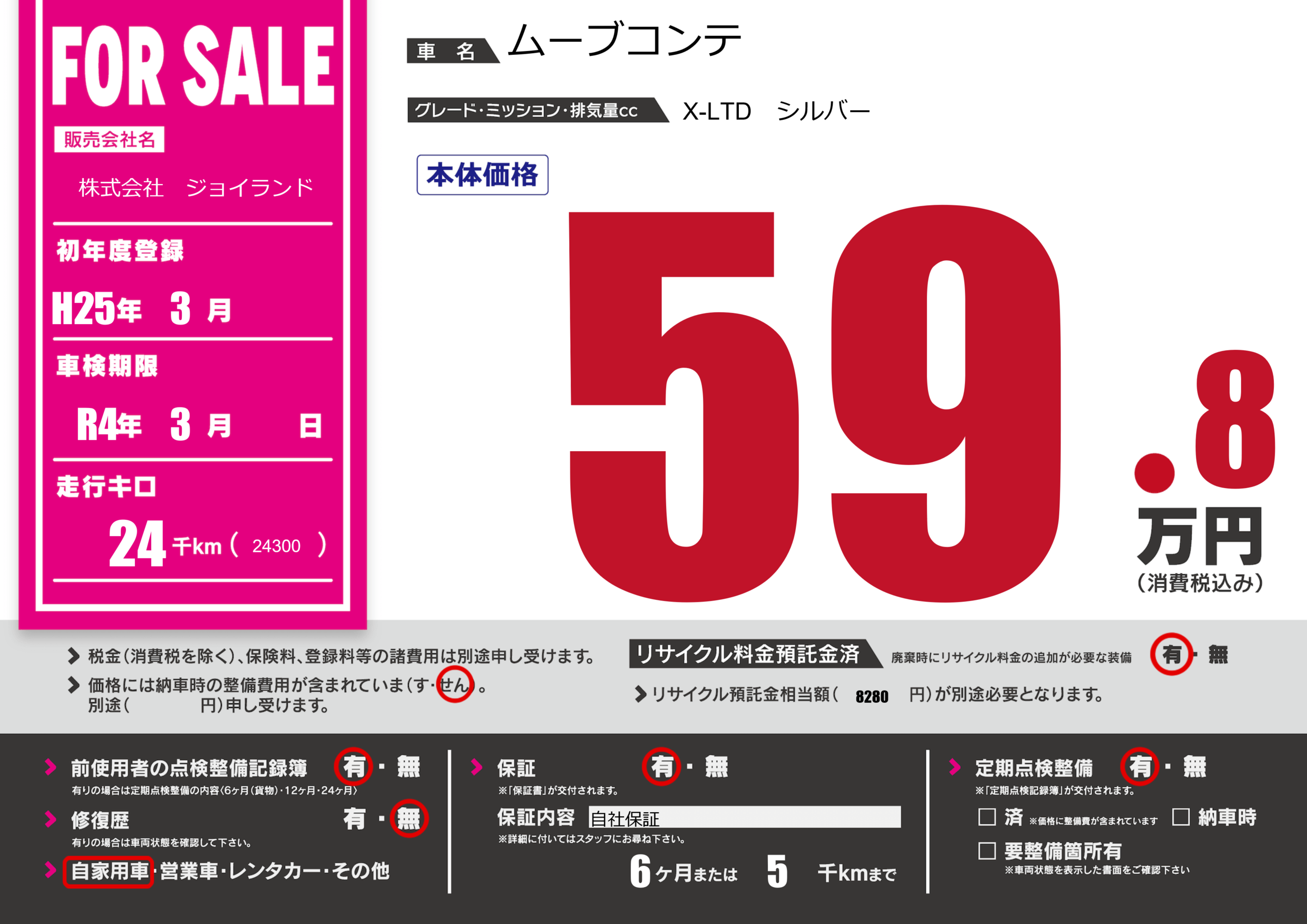 | 車名 | ムーブコンテ | グレード ミッション 排気量 |