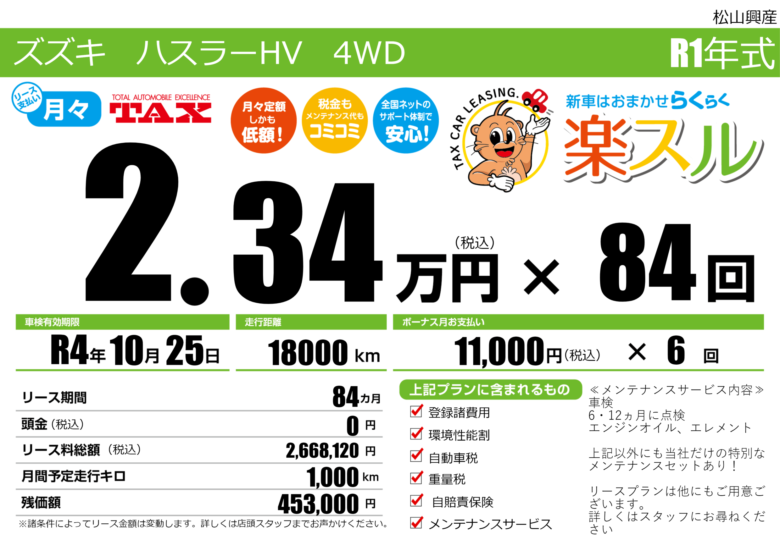 | 車名 | ズズキ ハスラーHV 4WD | グレード ミッション 排気量 |