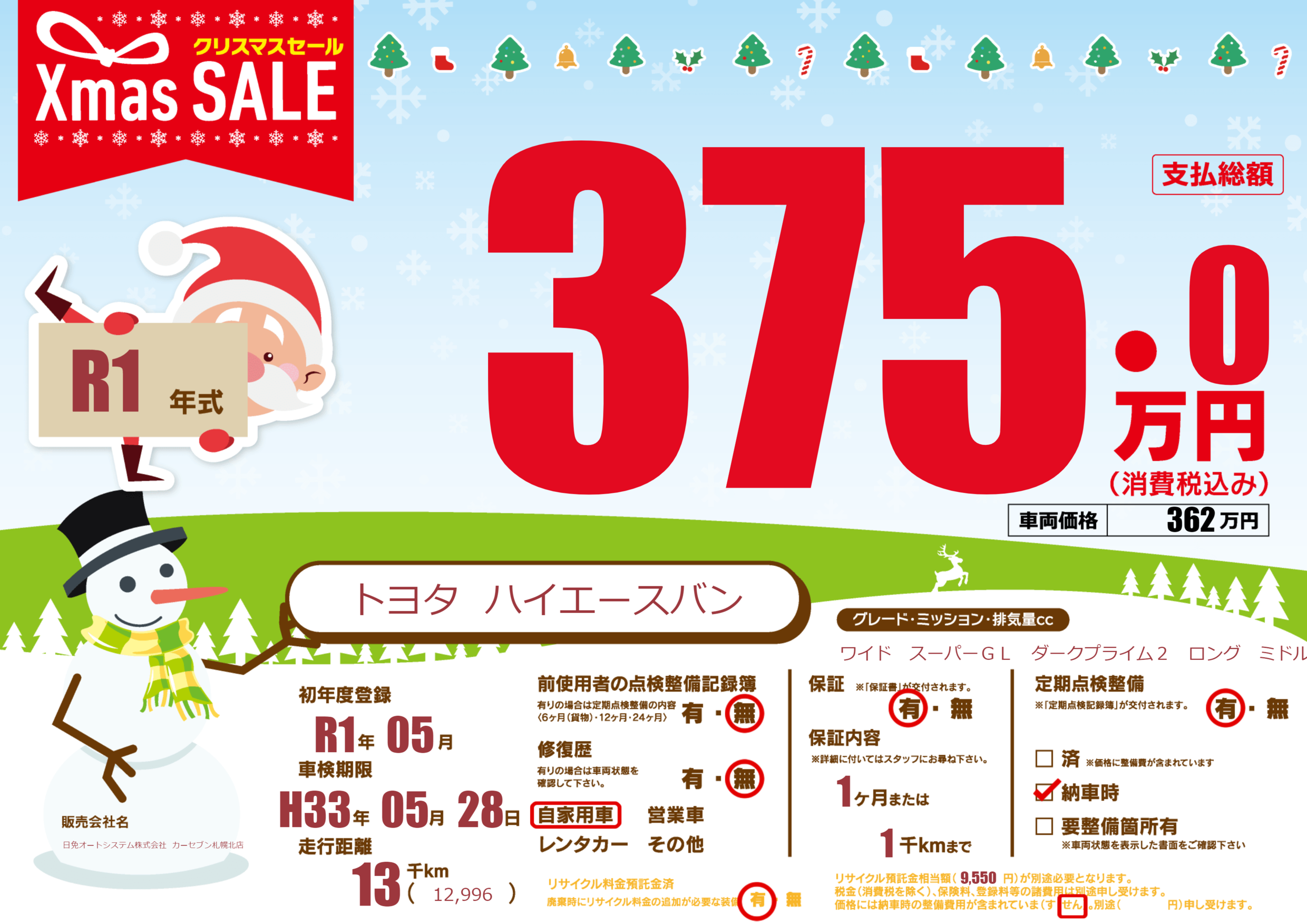 | 定期点検整備 | 定期点検整備あり 納車時あり | ||