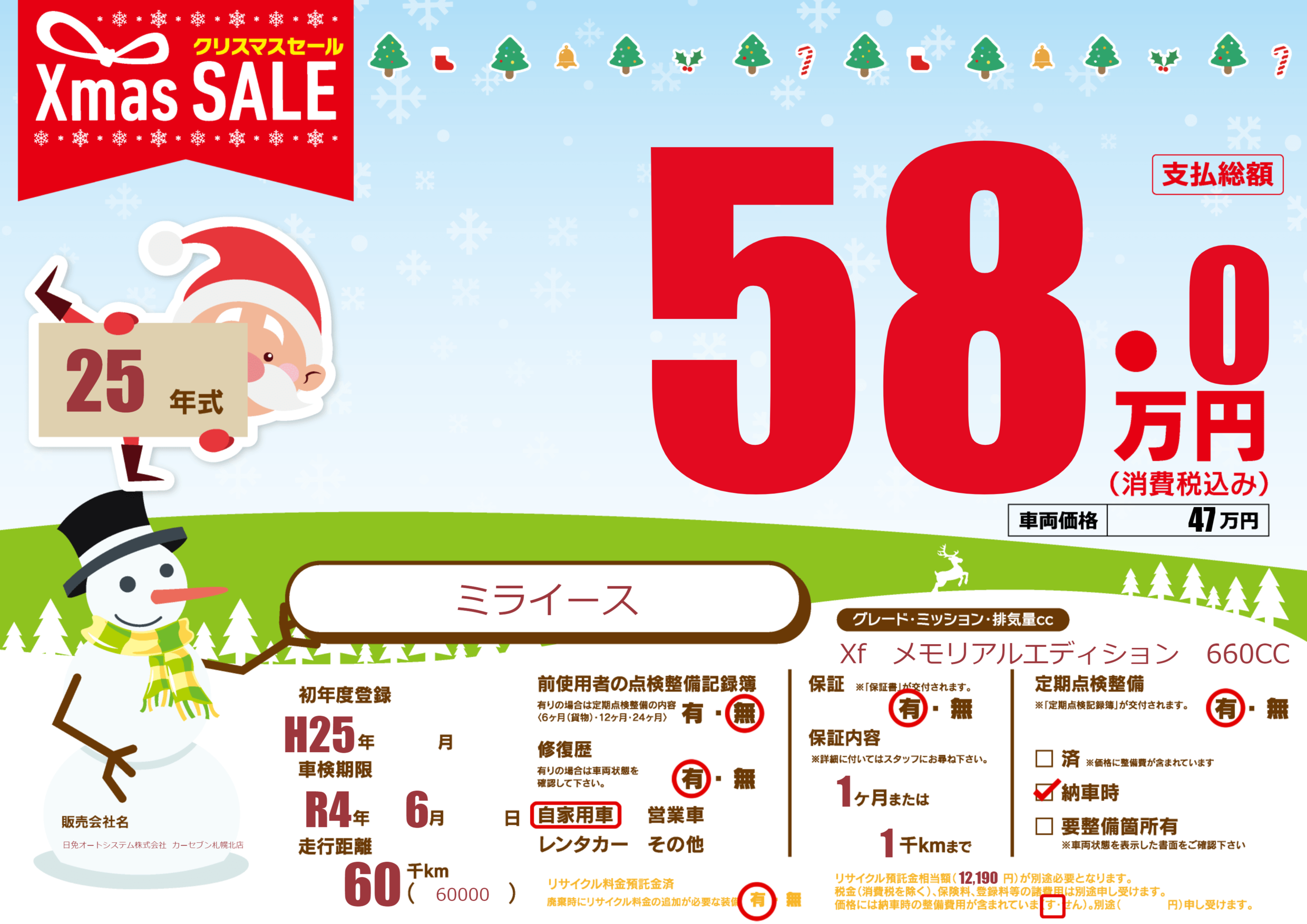 | 定期点検整備 | 定期点検整備あり 納車時あり | ||
