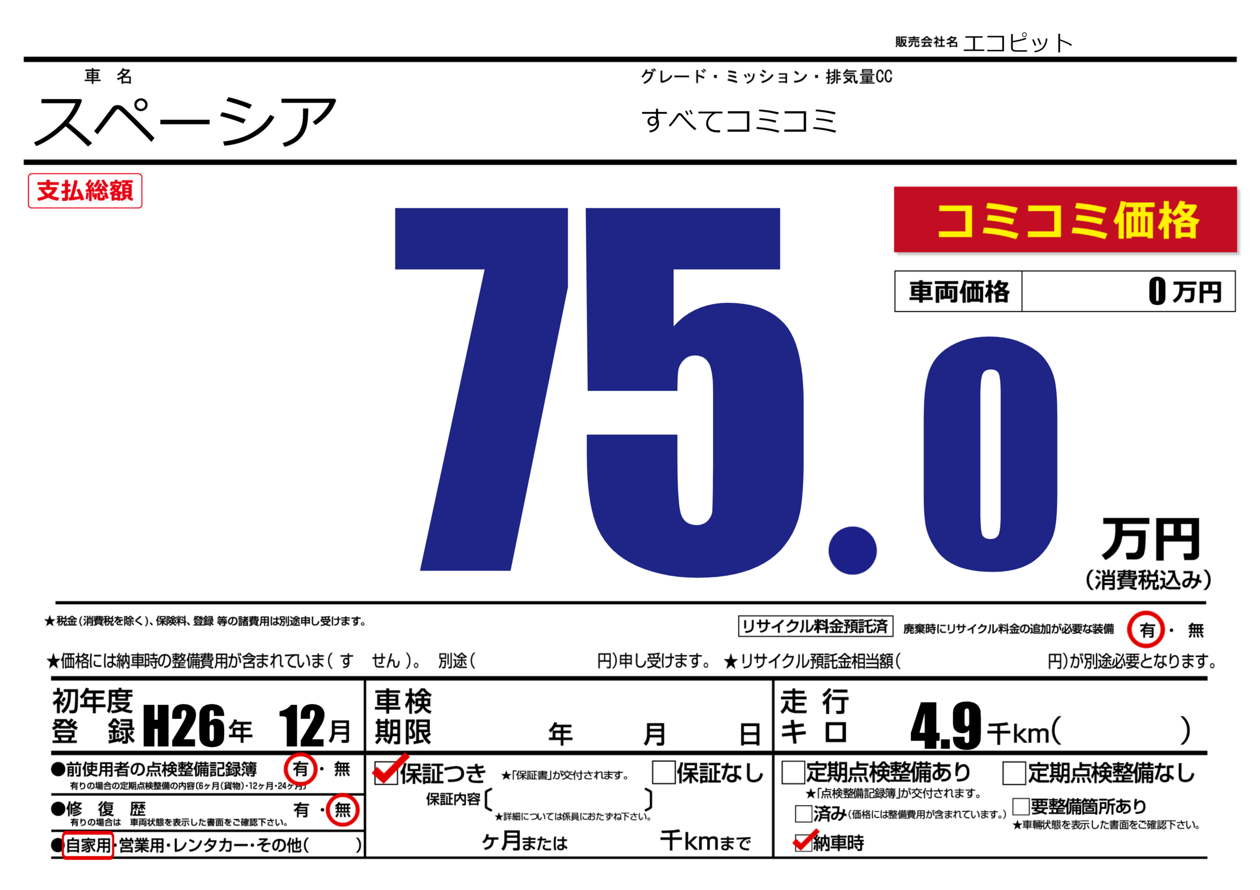 | 車名 | スペーシア | グレード ミッション 排気量 |