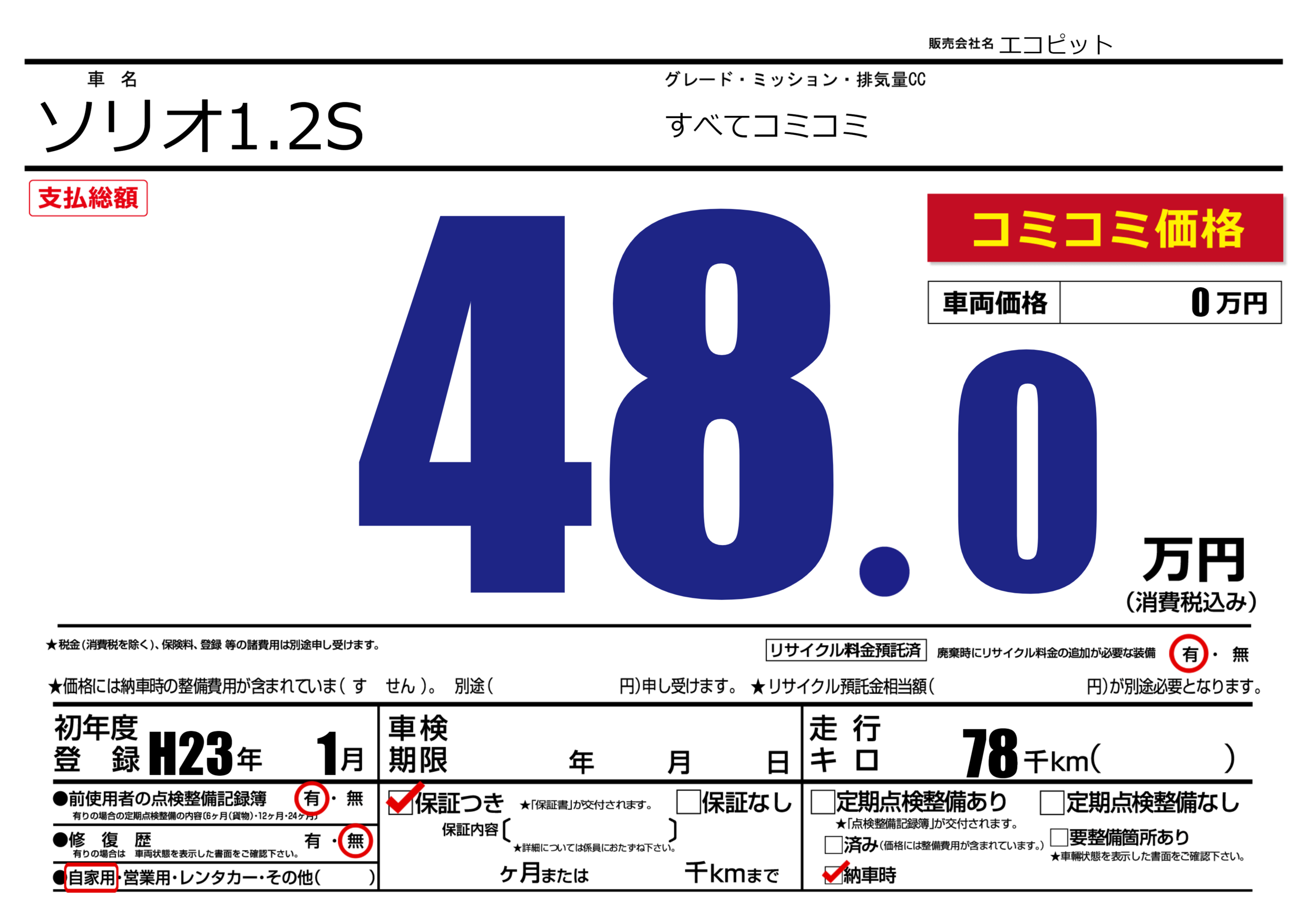 | 車名 | ソリオ1.2S | グレード ミッション 排気量 |