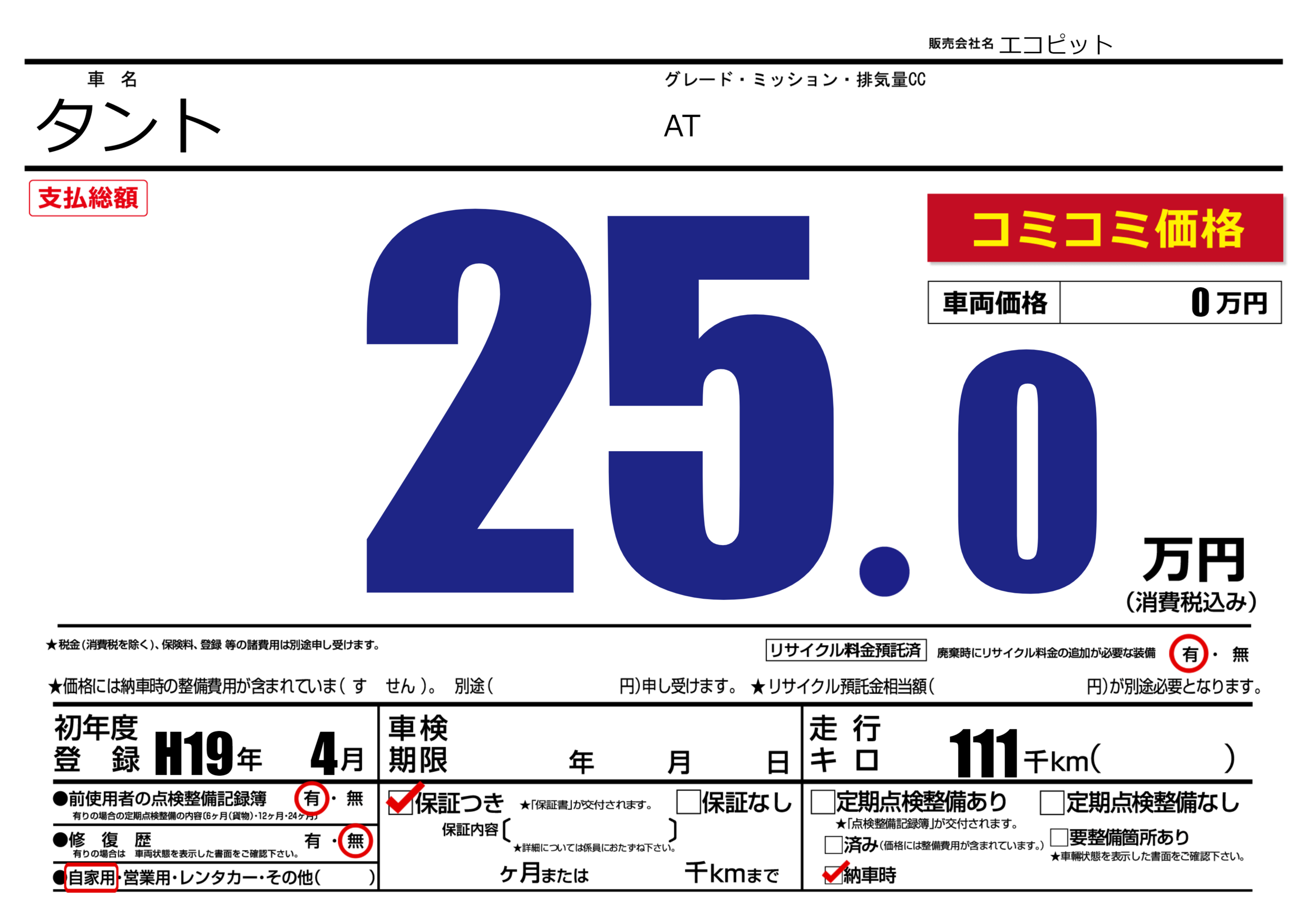 | 走行キロ | 11.1万km | 初年度登録 | H19年4月 |