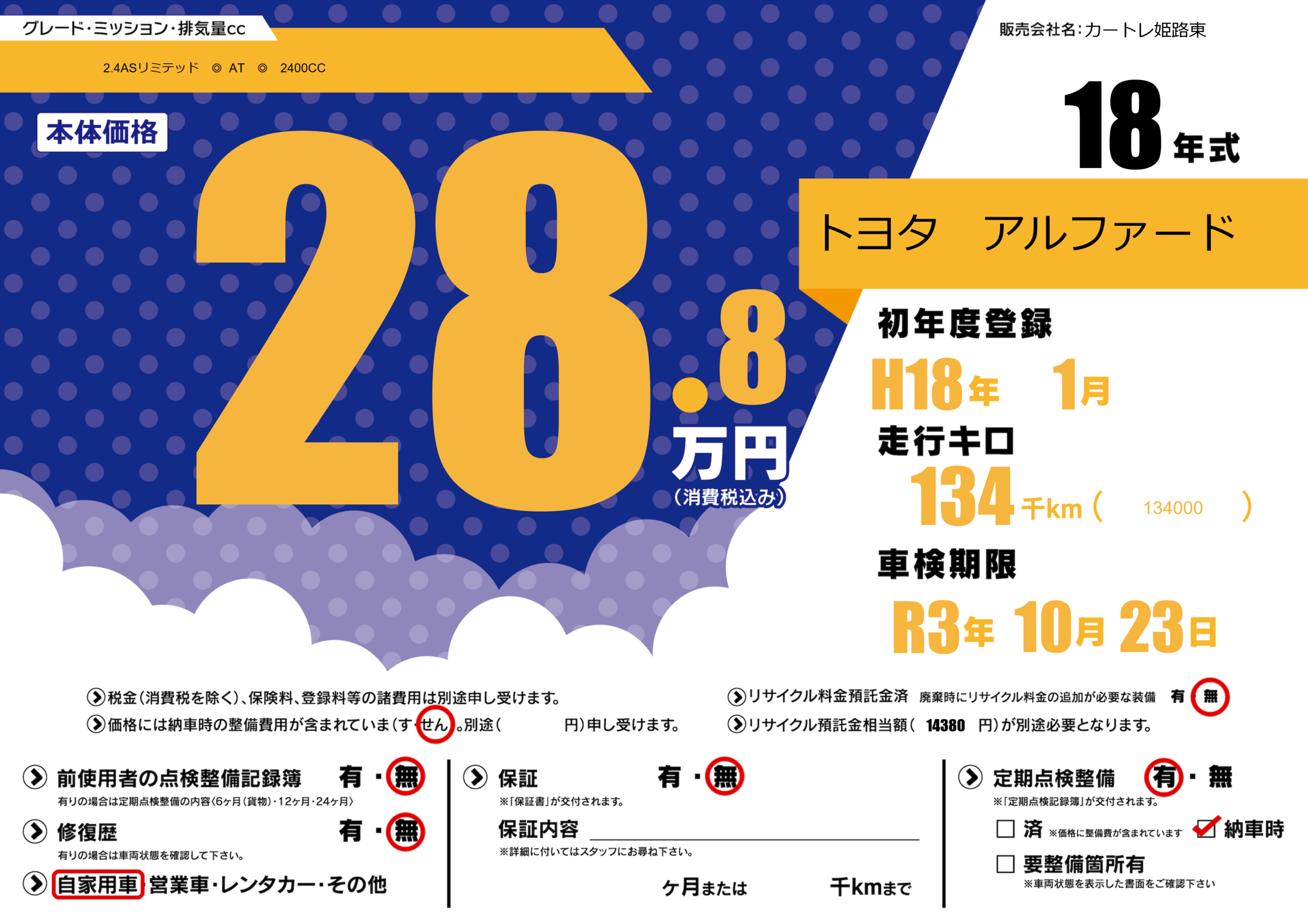 なし | 車検制限 | R3年10月23月 |