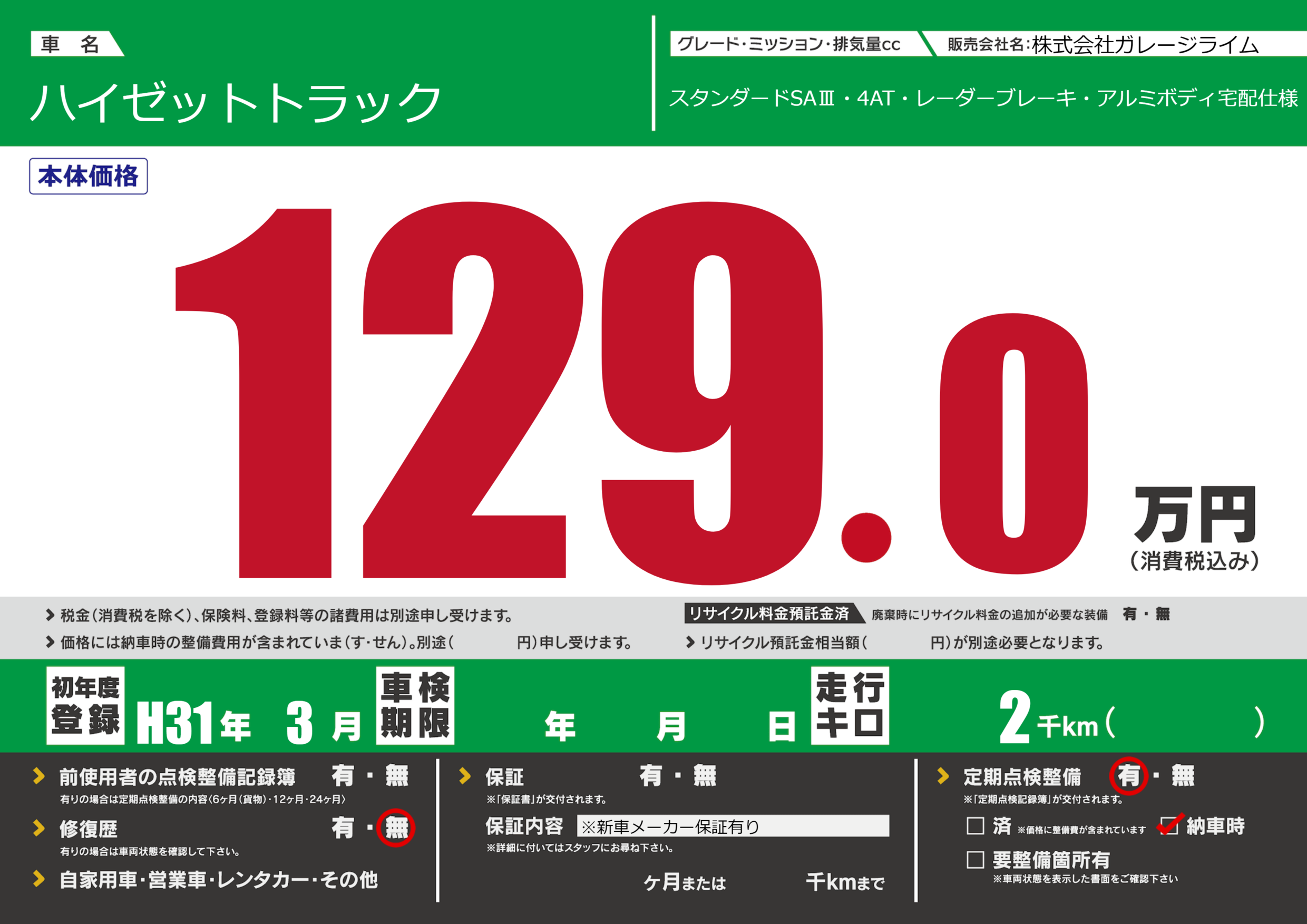 保証なし 保証内容(※新車メーカー保証有り) ---ヶ月または()千kmまで |