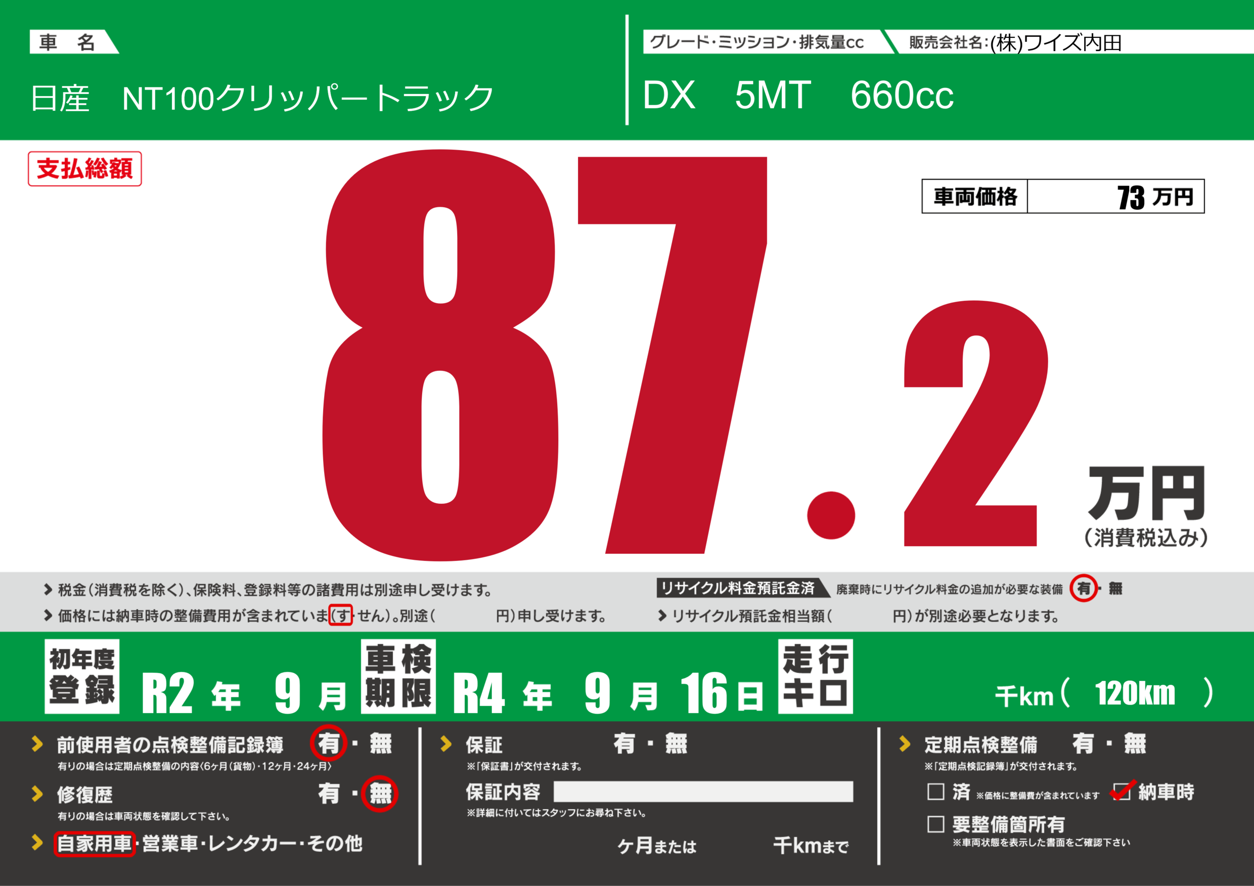 | 車名 | 日産 NT100クリッパートラック | グレード ミッション 排気量 |