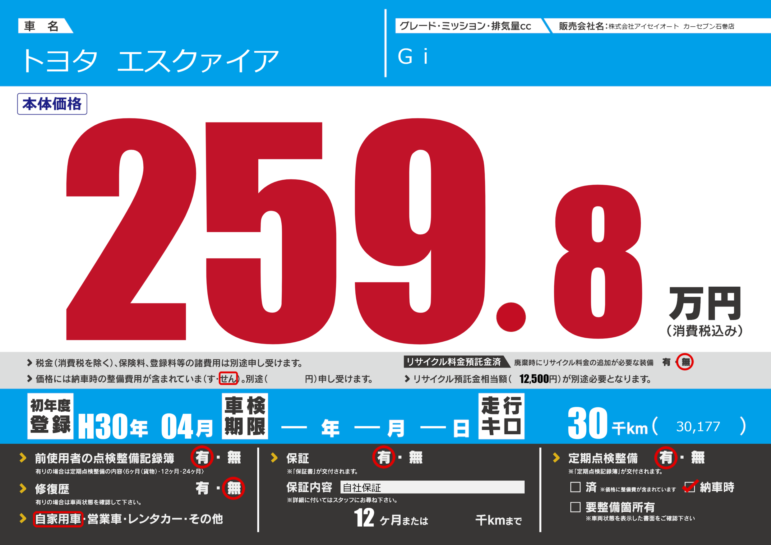 保証付き 保証内容(自社保証) 12ヶ月または()千kmまで |