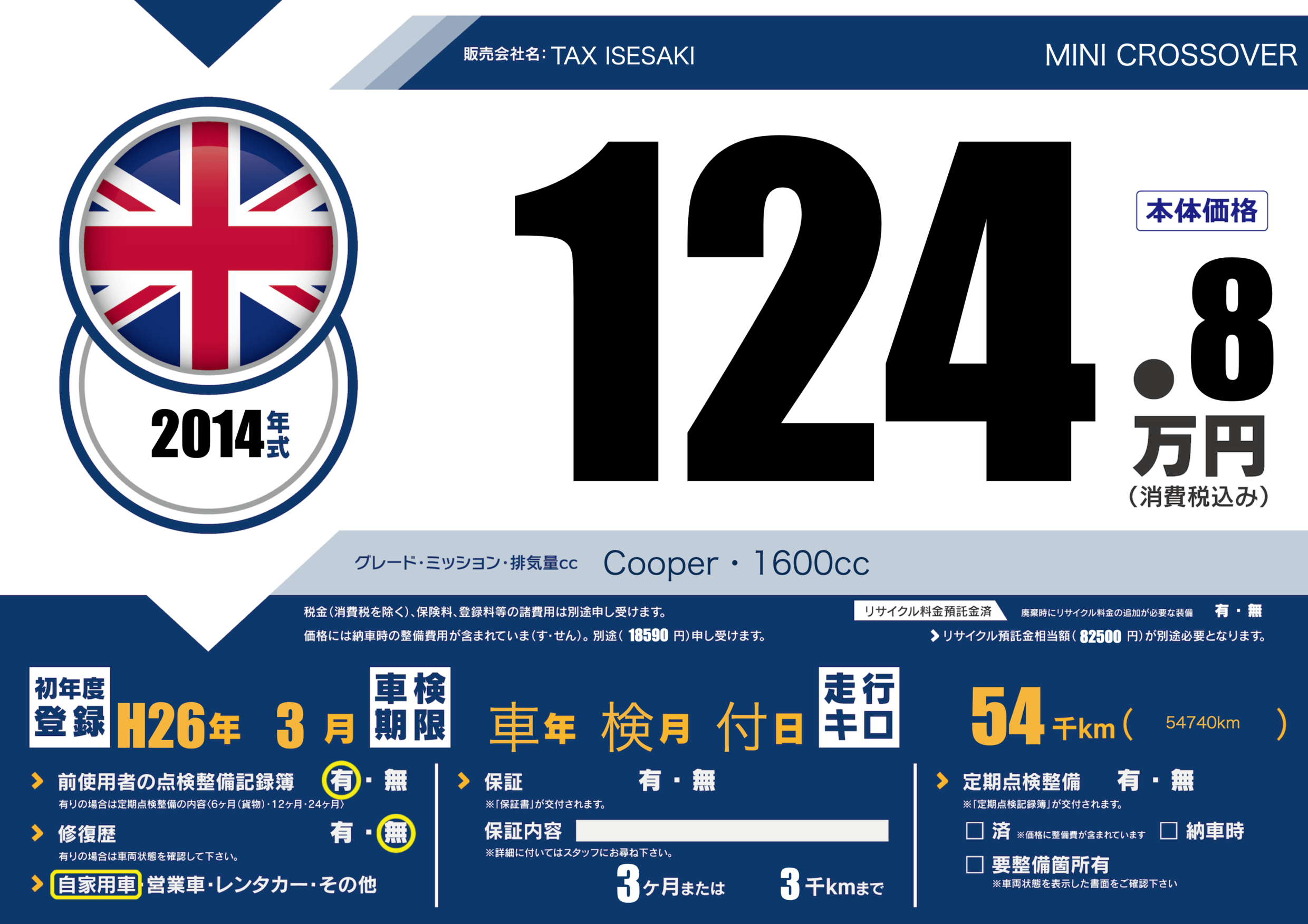 | 車名 | MINI CROSSOVER | グレード ミッション 排気量 |