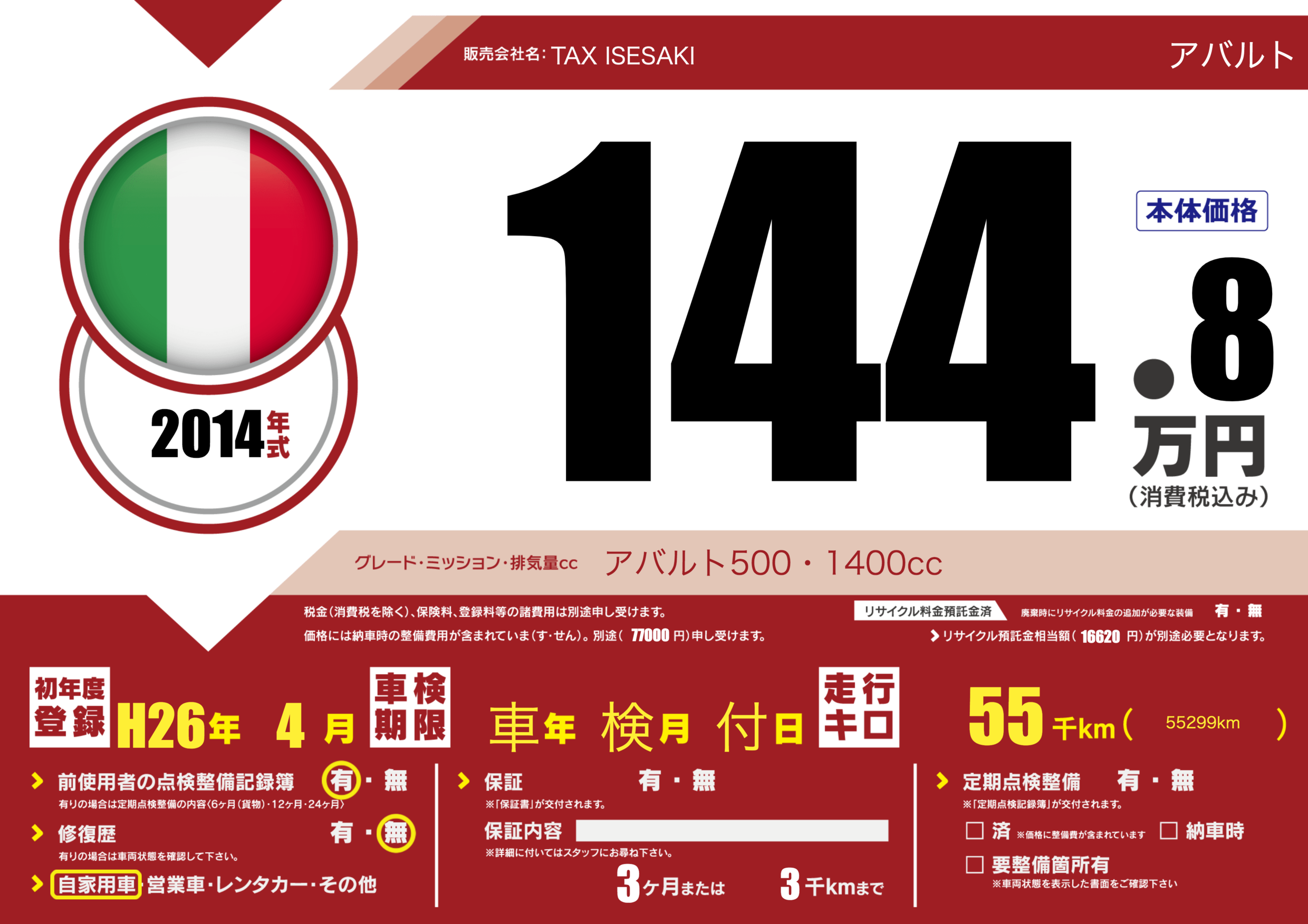 | 車名 | アバルト | グレード ミッション 排気量 |