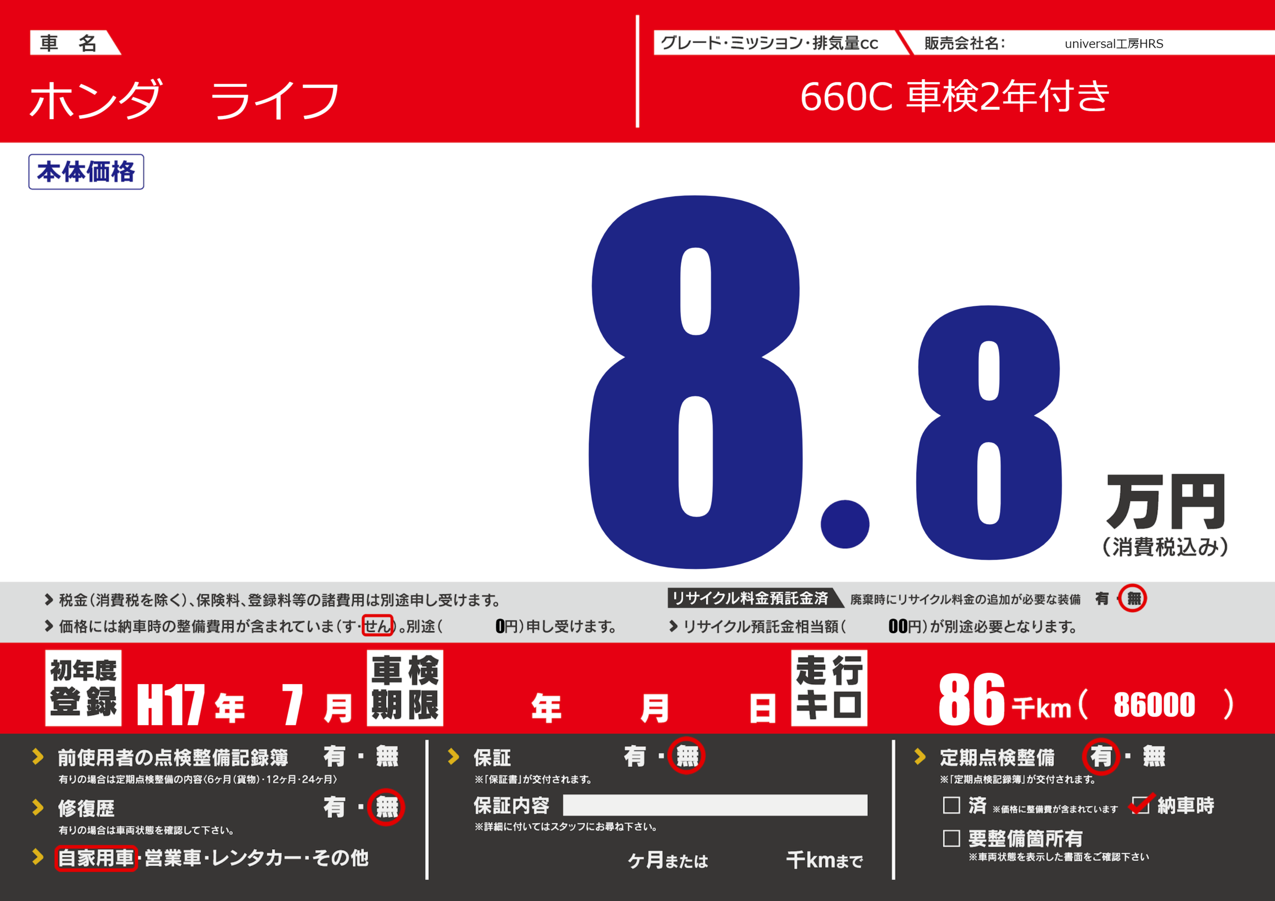 | 車名 | ホンダ ライフ | グレード ミッション 排気量 |