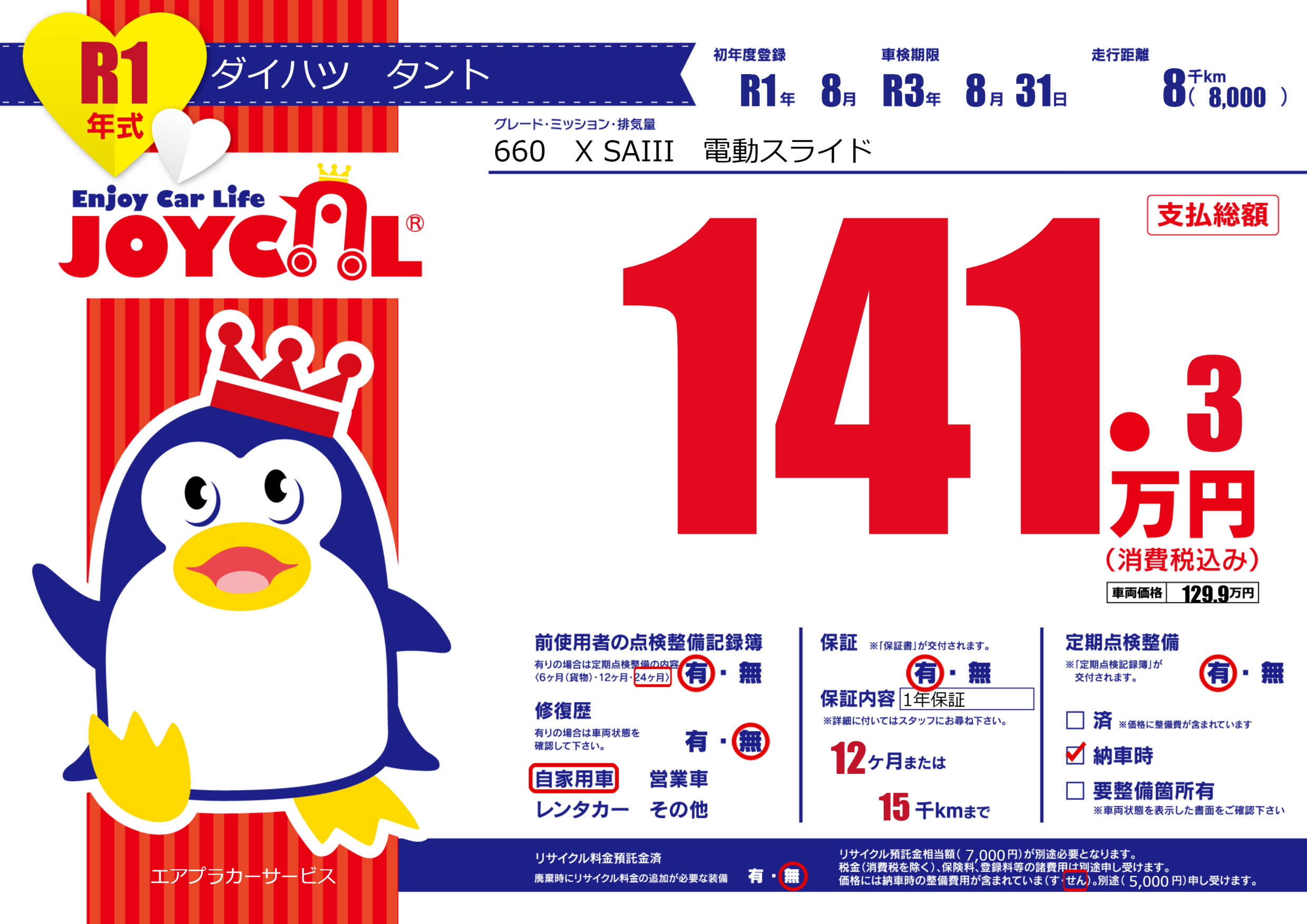 | 走行キロ | 0.8万km | 初年度登録 | R1年8月 |