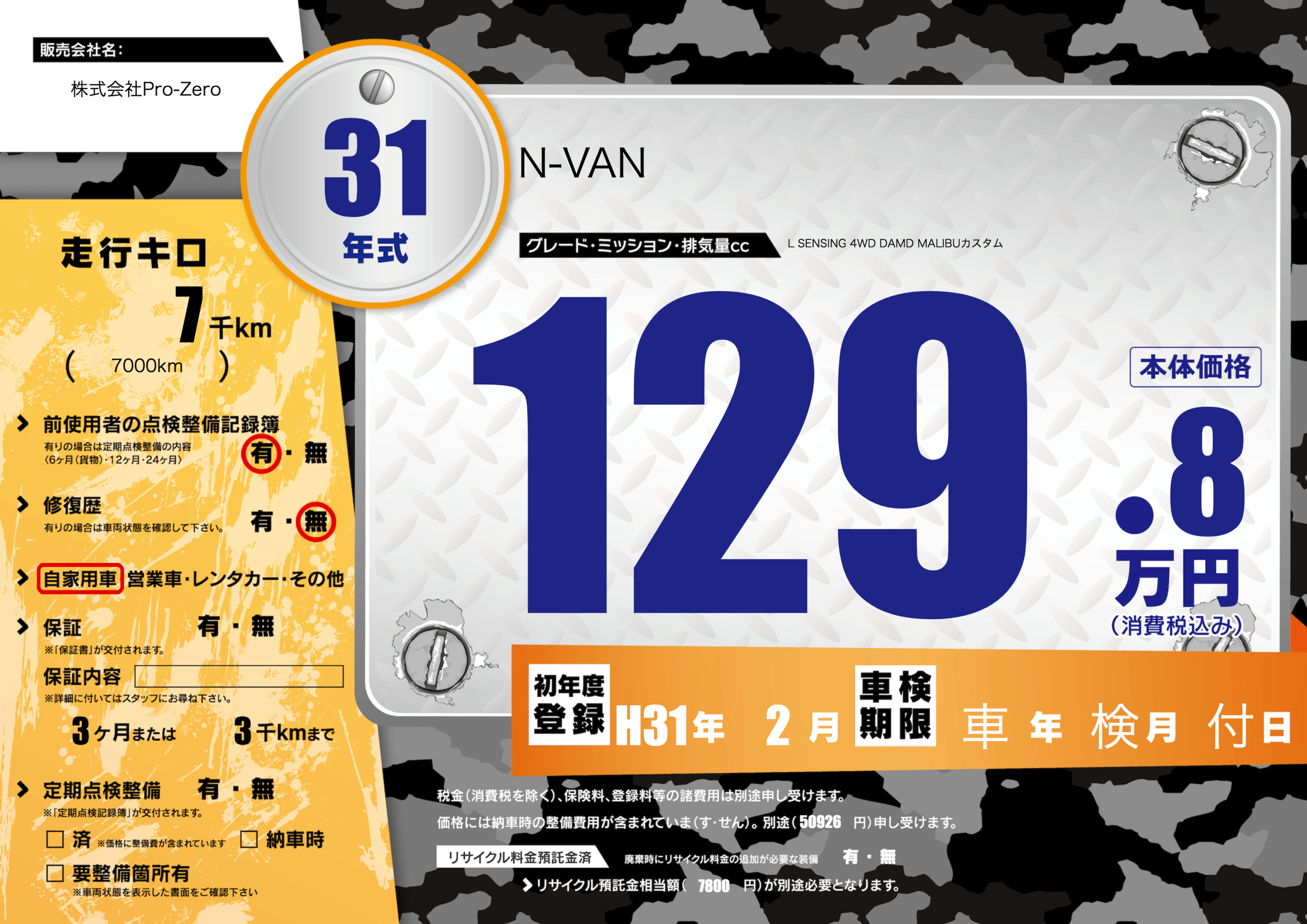 | 走行キロ | 0.7万km | 初年度登録 | H31年2月 |
