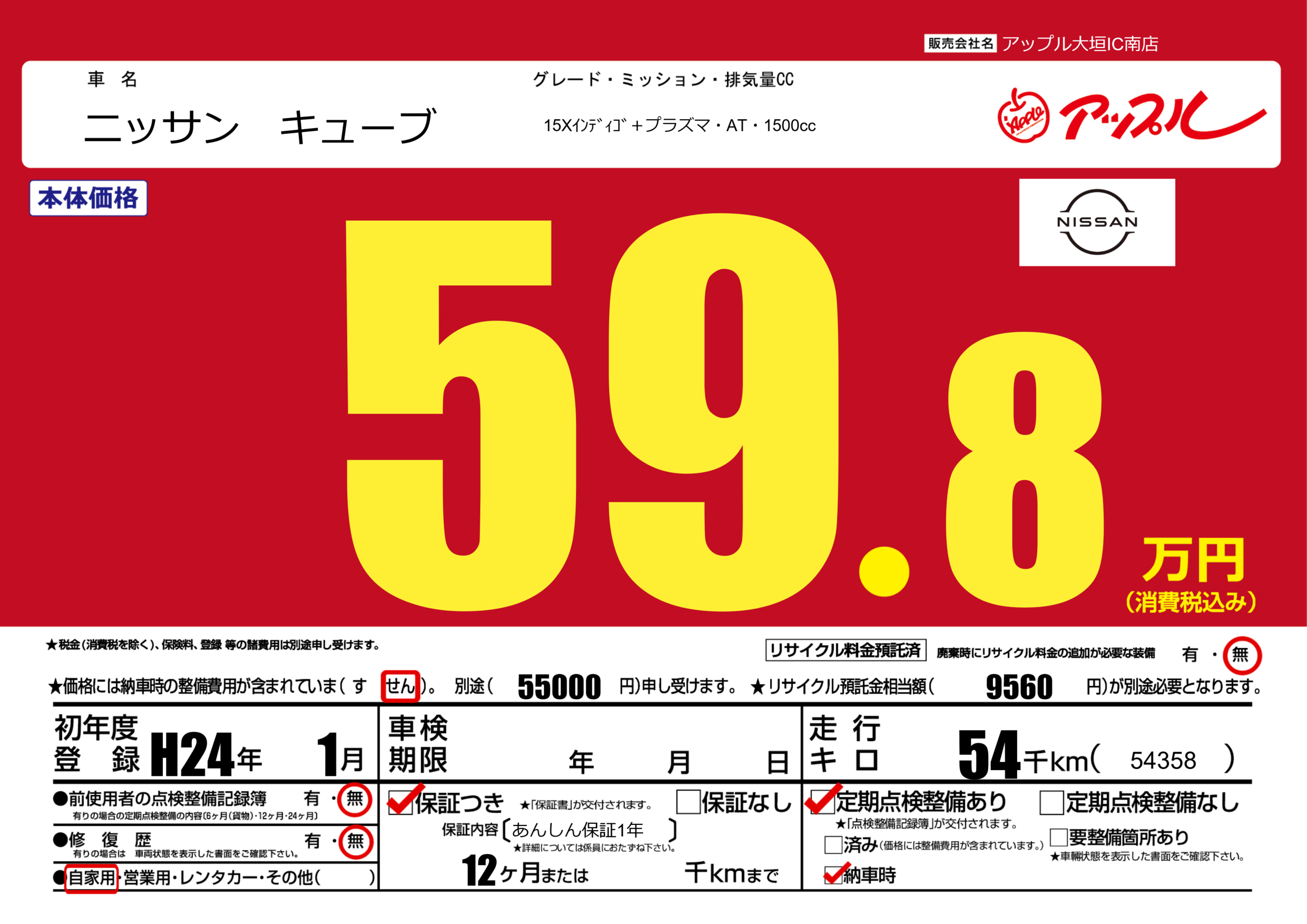 | 車名 | ニッサン キューブ | グレード ミッション 排気量 |