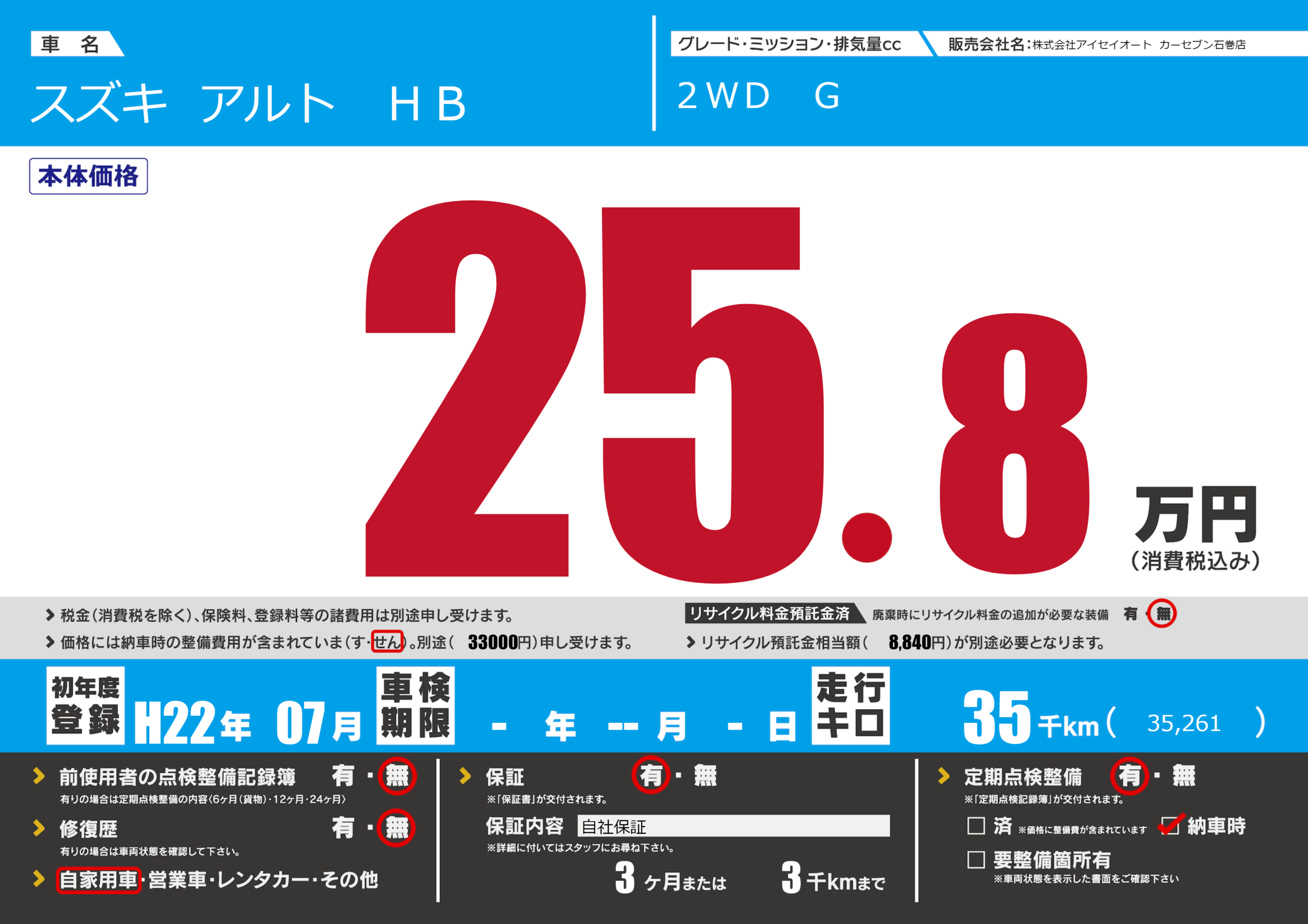 | 車名 | スズキ アルト HB | グレード ミッション 排気量 |