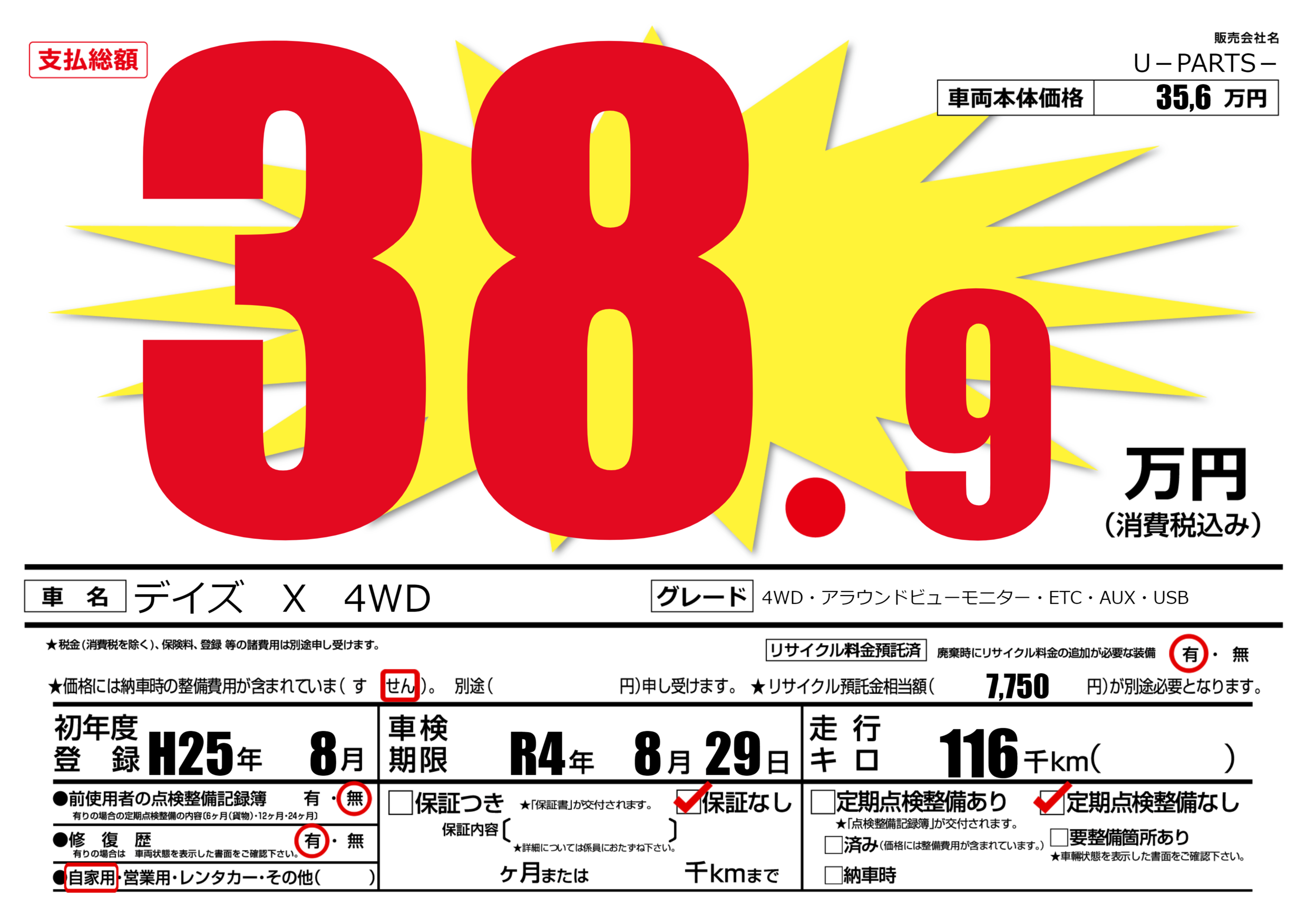 | 車名 | デイズ X 4WD | グレード ミッション 排気量 |