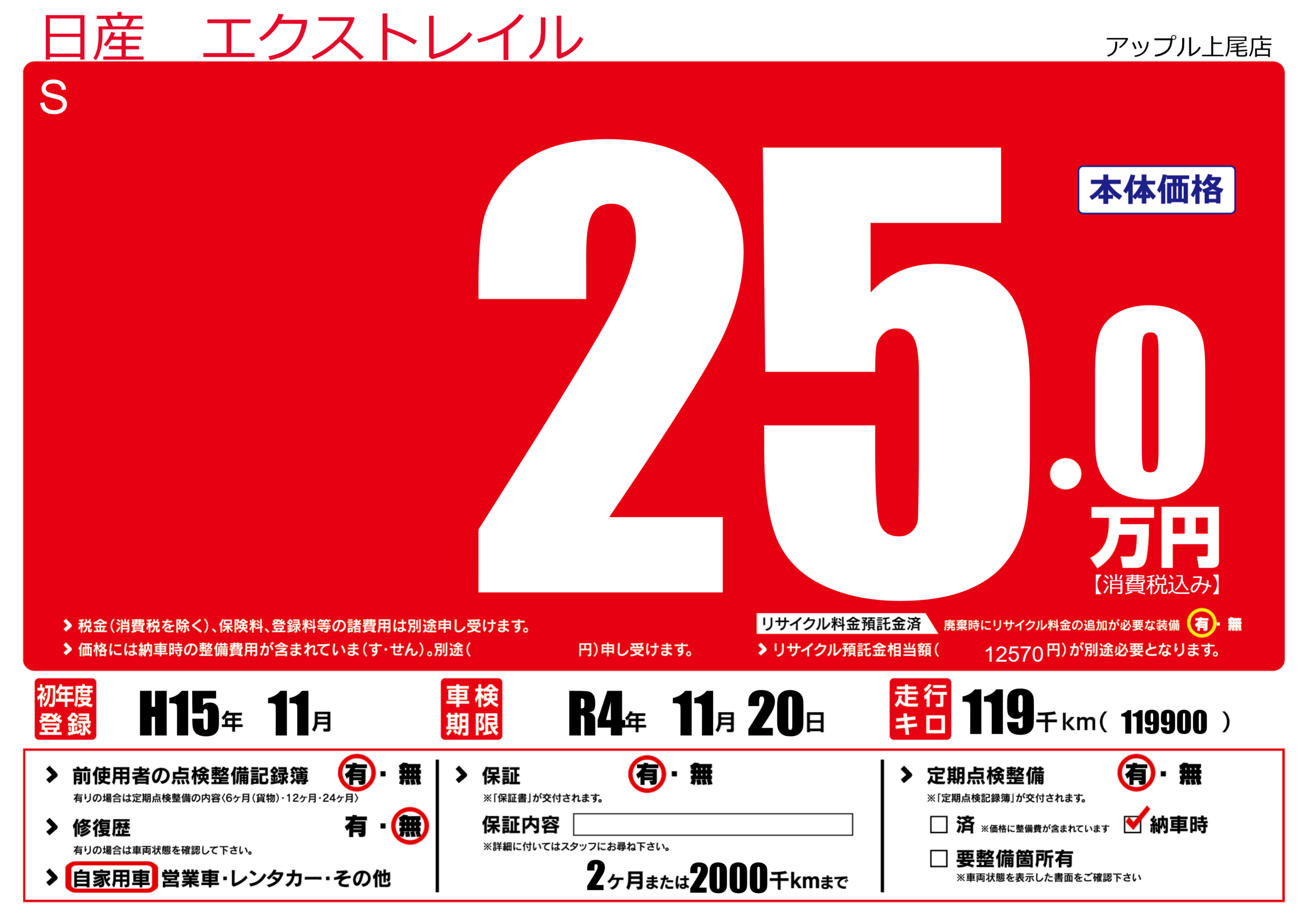 | 走行キロ | 11.9万km | 初年度登録 | H15年11月 |
