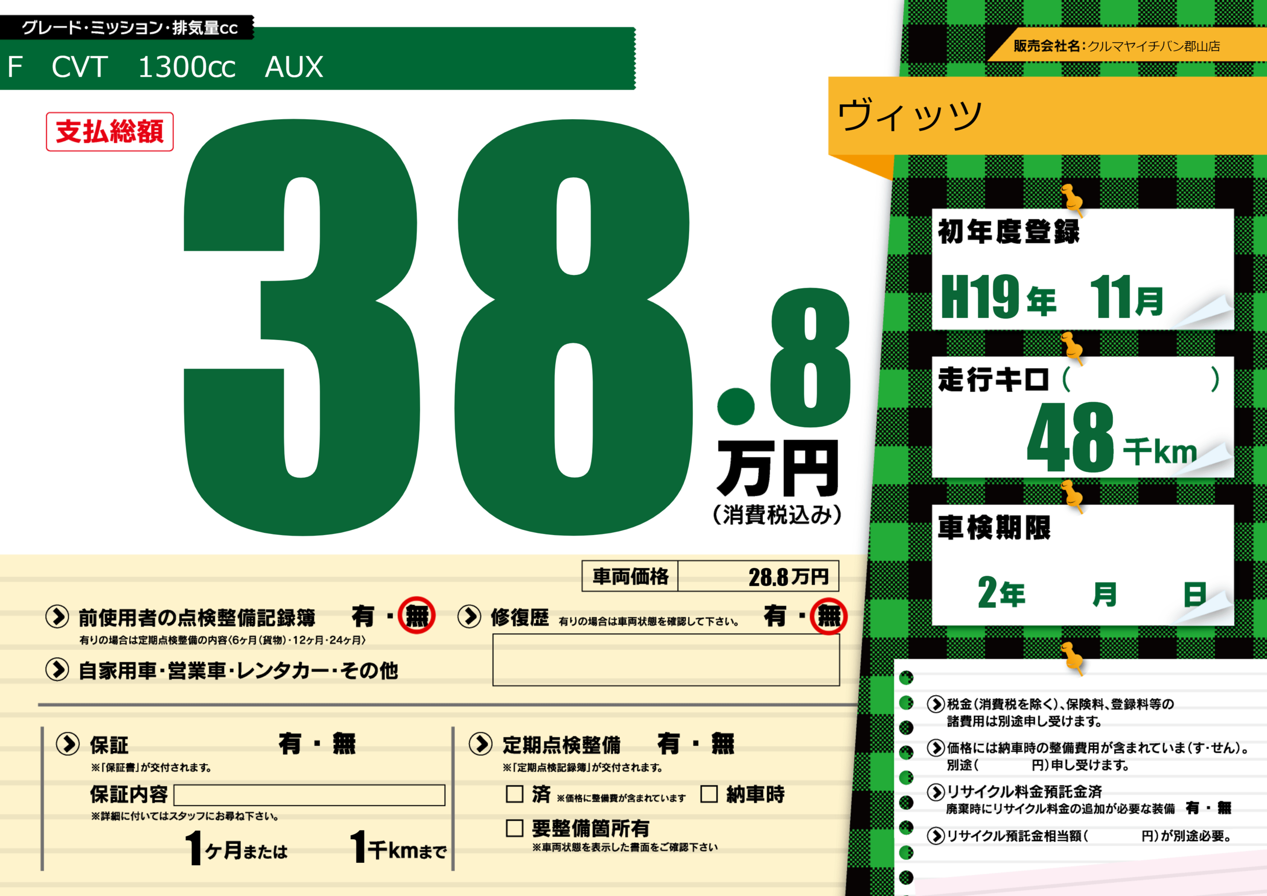 | 車名 | ヴィッツ | グレード ミッション 排気量 |