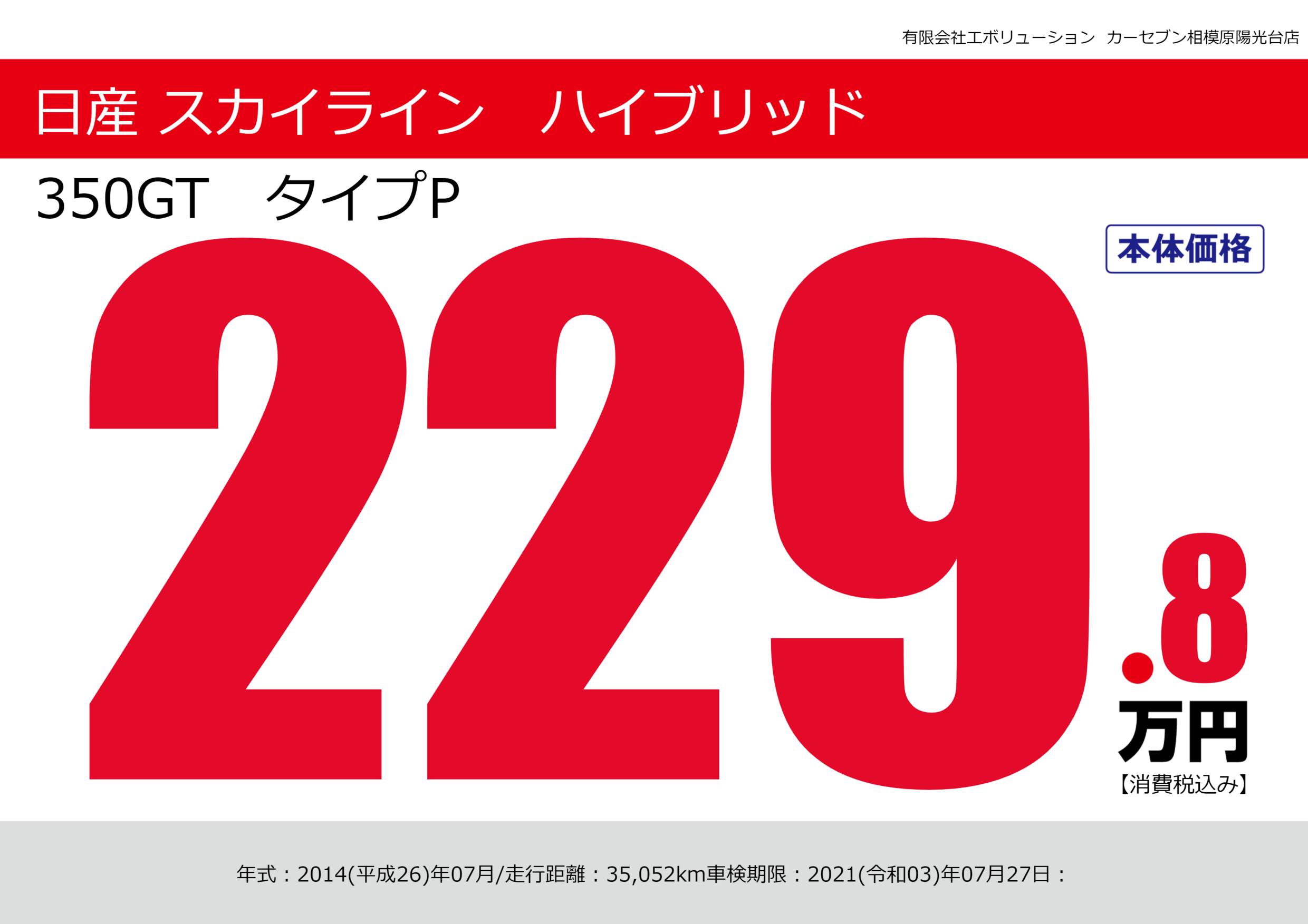 | 車名 | 日産 スカイライン ハイブリッド | グレード ミッション 排気量 |
