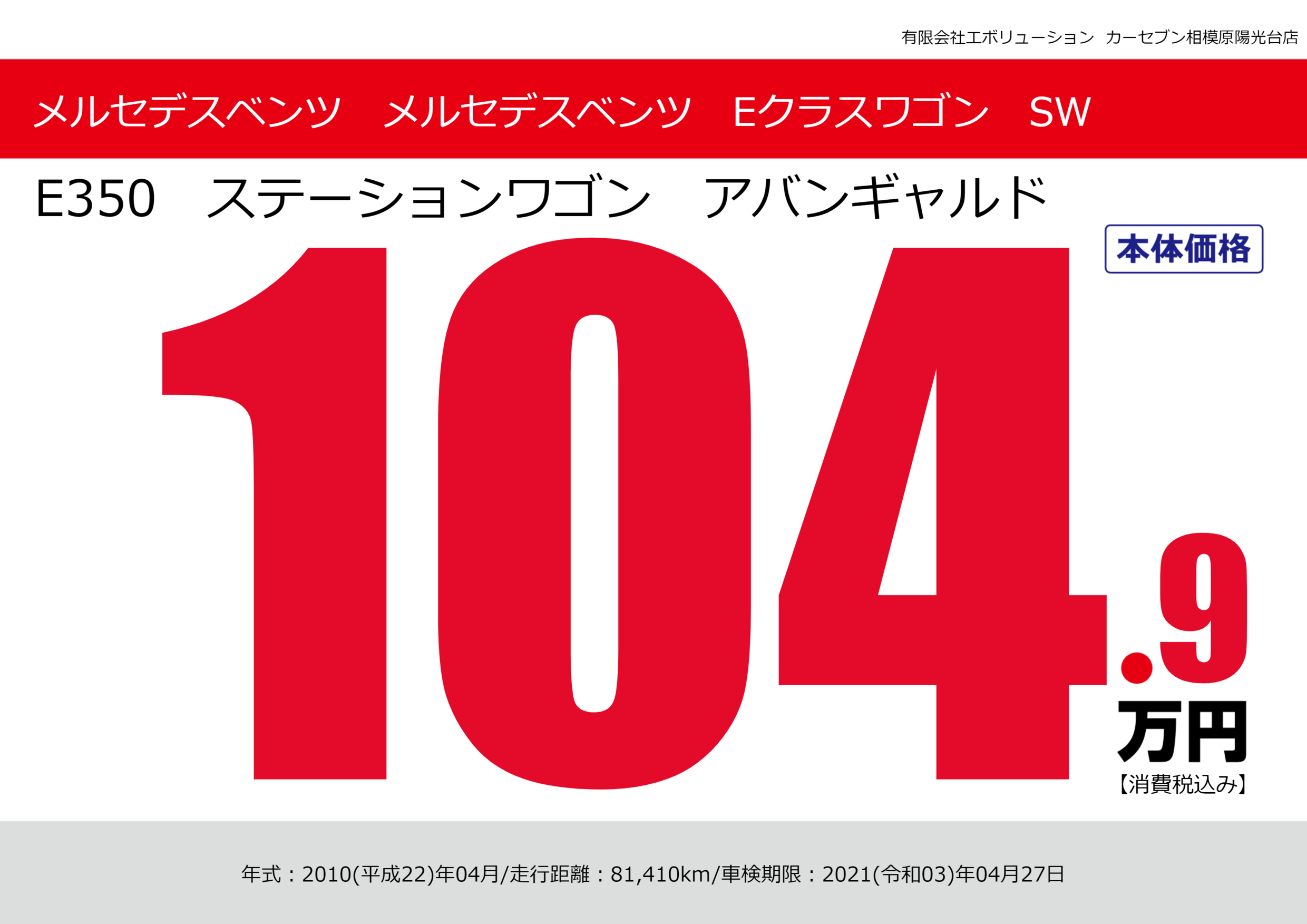 | 車名 | メルセデスベンツ メルセデスベンツ Eクラスワゴン SW | グレード ミッション 排気量 |