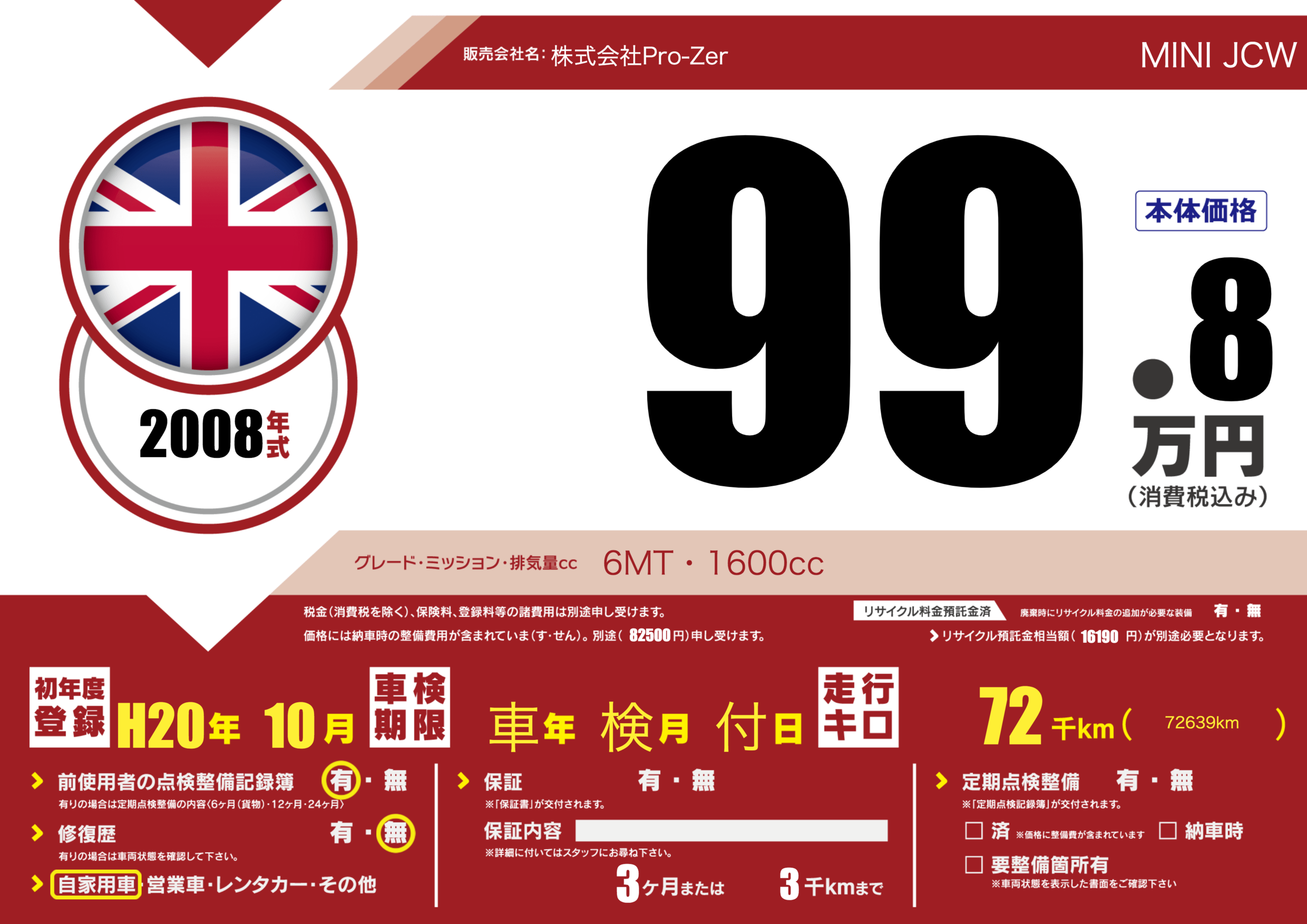 | 車名 | MINI JCW | グレード ミッション 排気量 |