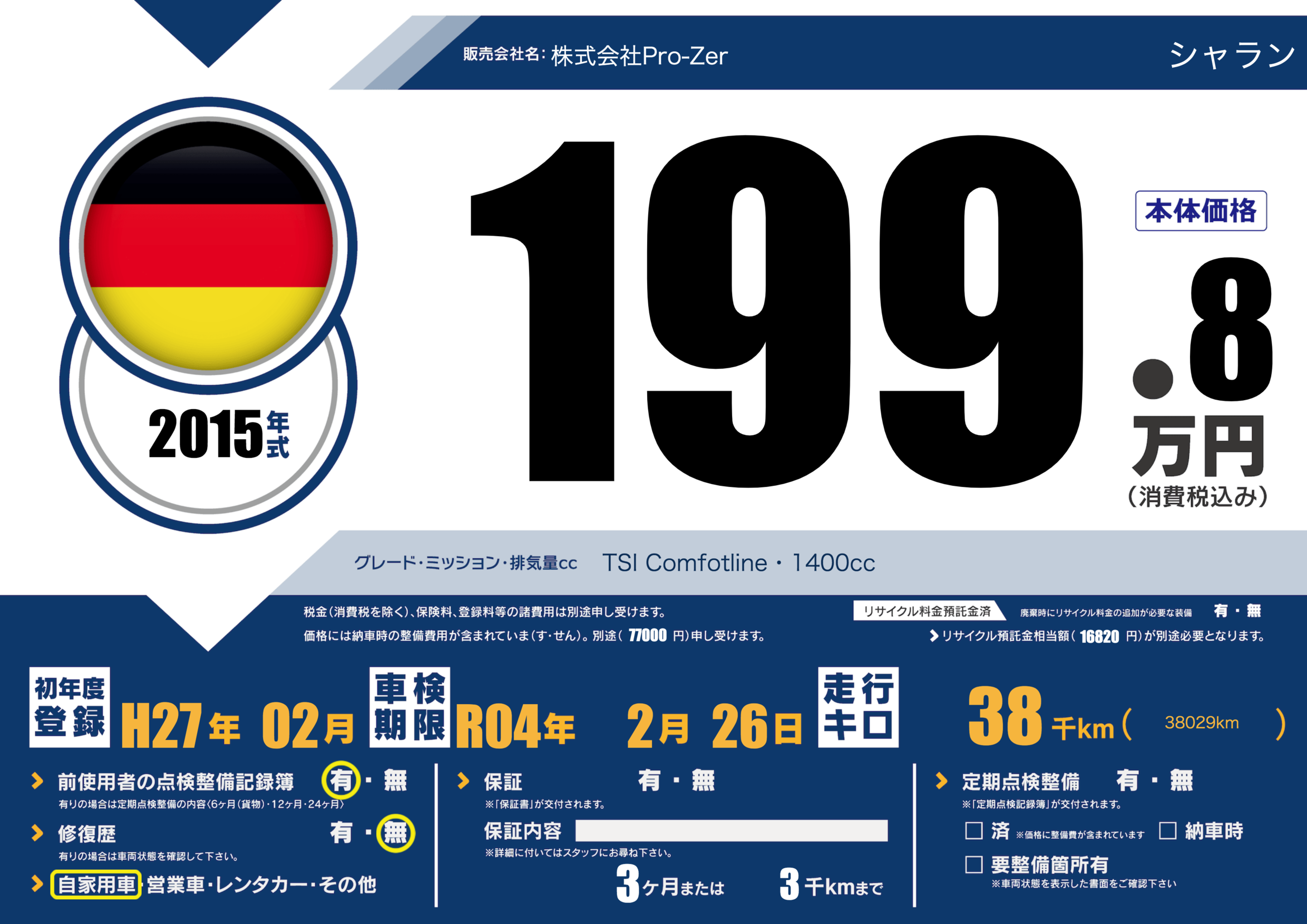 | 車名 | シャラン | グレード ミッション 排気量 |
