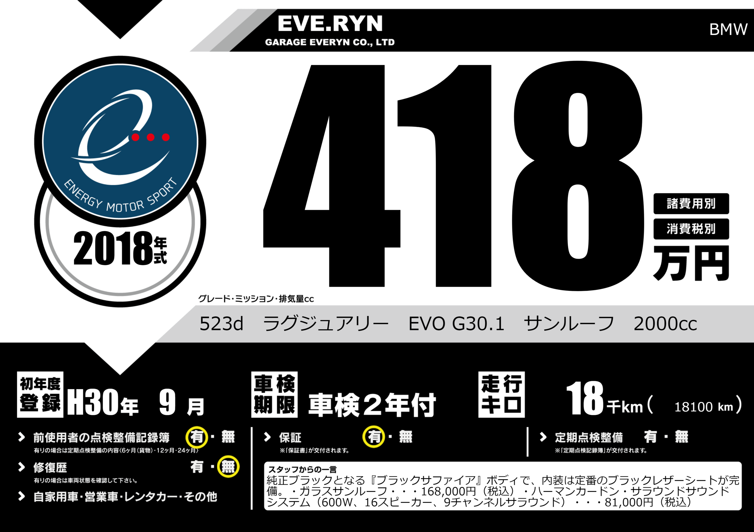 523d ラグジュアリー EVO G30.1 サンルーフ 2000cc |