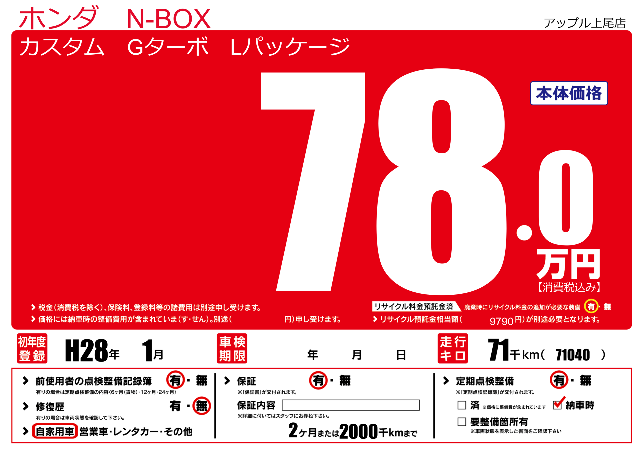 保証付き 保証内容(---) 2ヶ月または(2000)千kmまで |