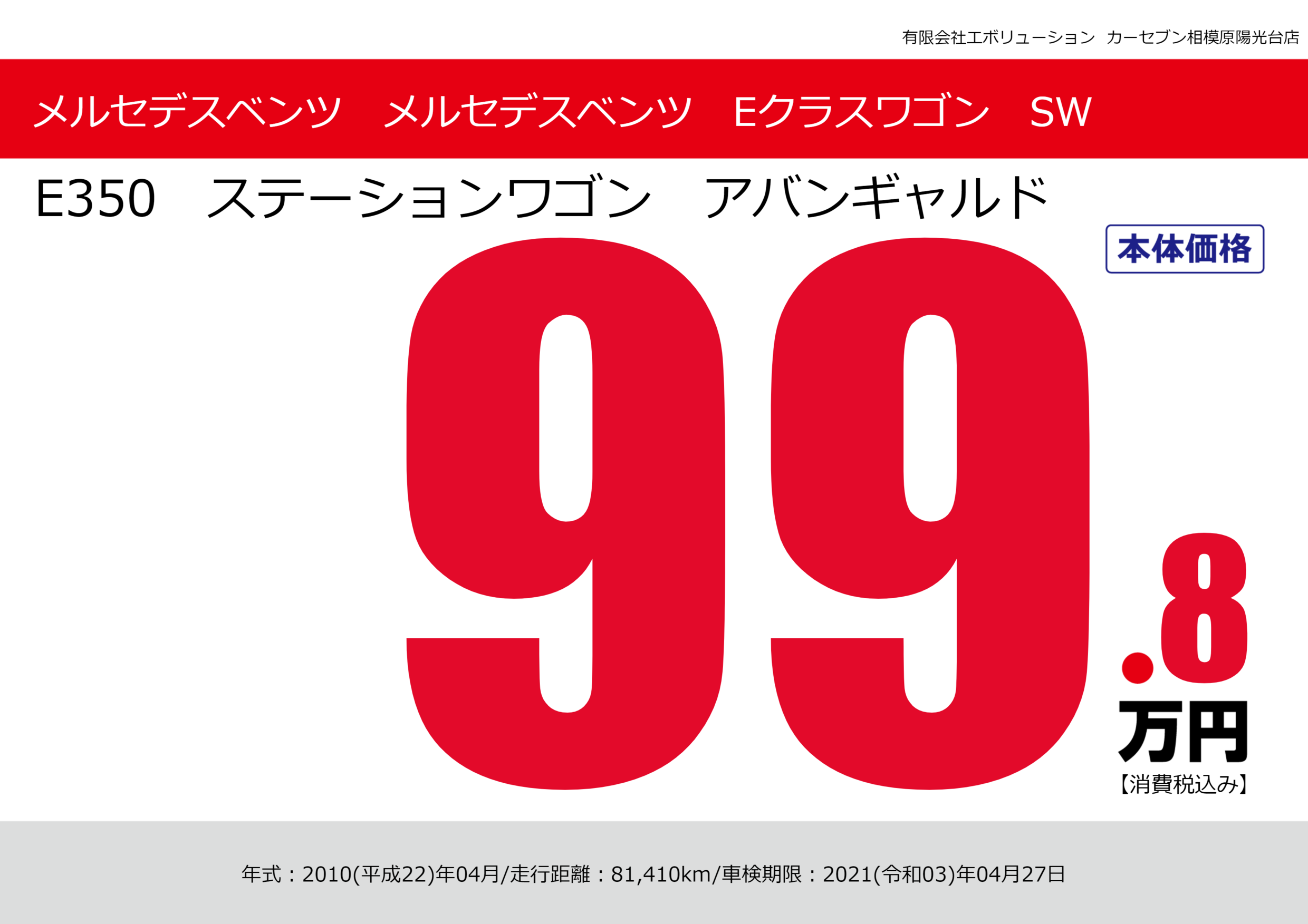 | 車名 | メルセデスベンツ メルセデスベンツ Eクラスワゴン SW | グレード ミッション 排気量 |