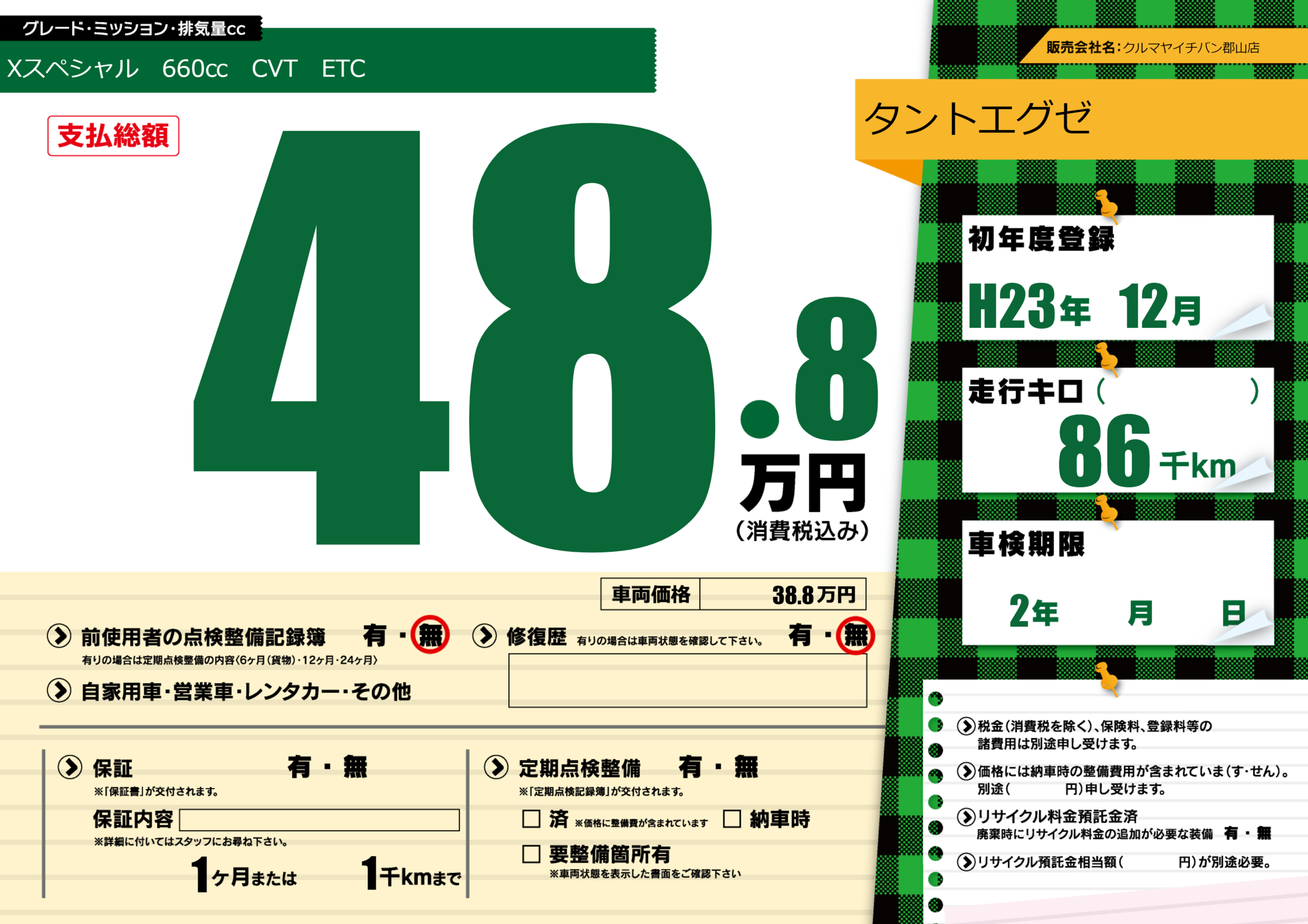| 走行キロ | 8.6万km | 初年度登録 | H23年12月 |