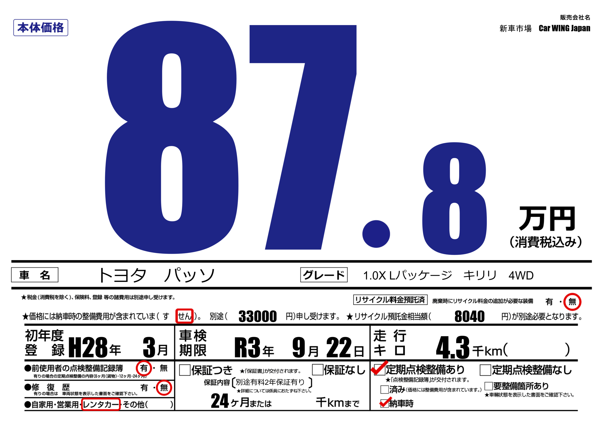 | 車名 | トヨタ パッソ | グレード ミッション 排気量 |