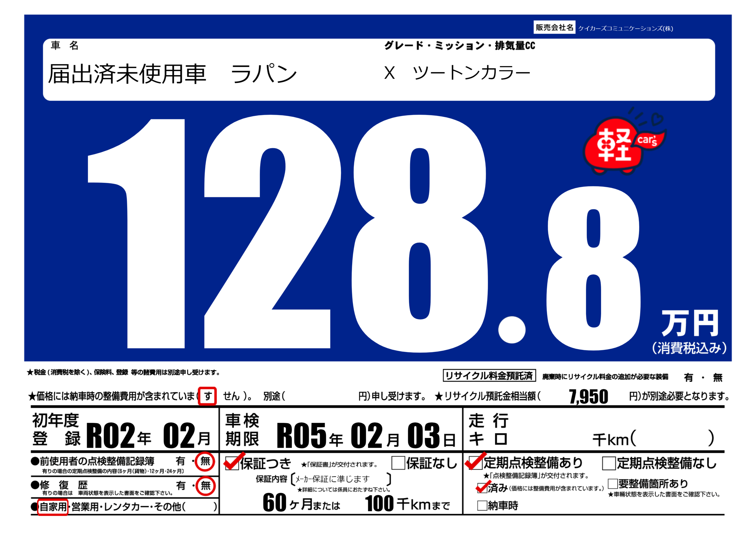 | 定期点検整備 | 定期点検整備あり 定期点検整備済み | ||