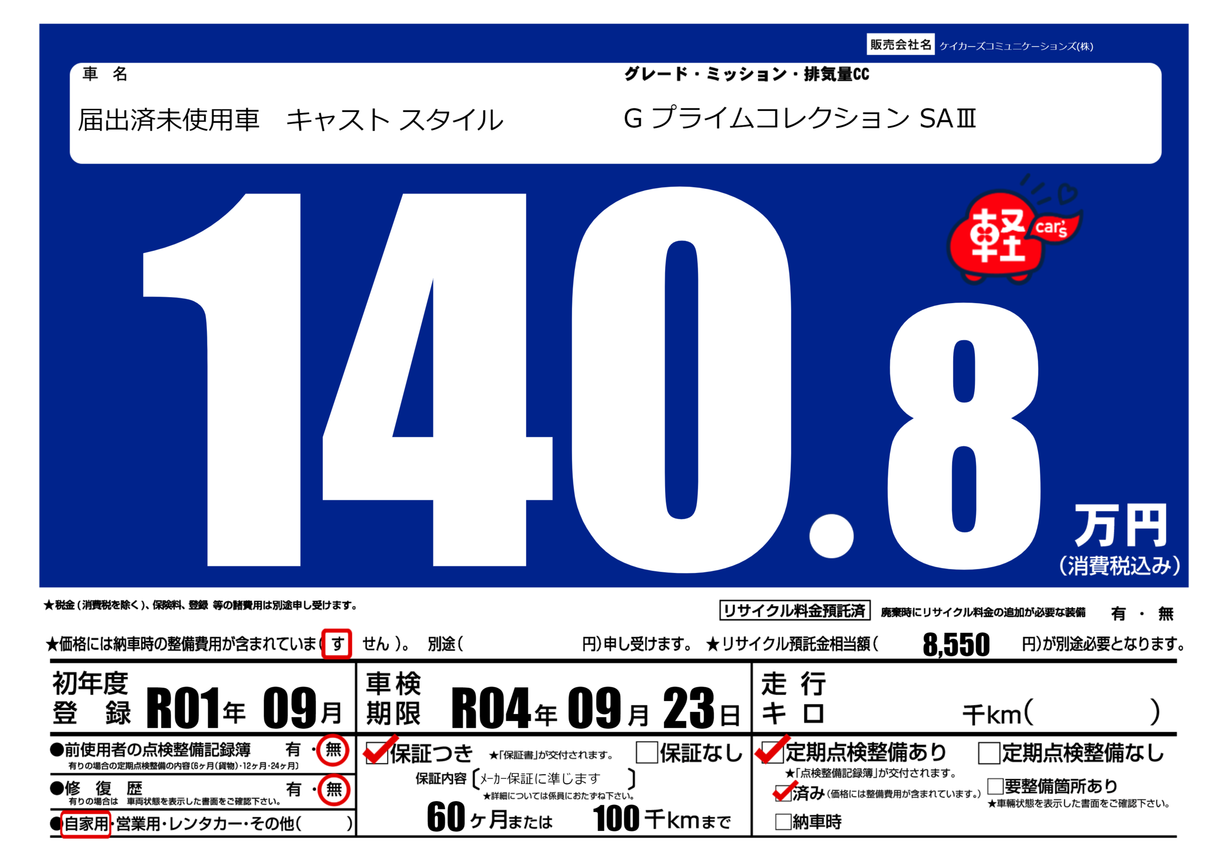 | 車名 | 届出済未使用車 キャスト スタイル | グレード ミッション 排気量 |