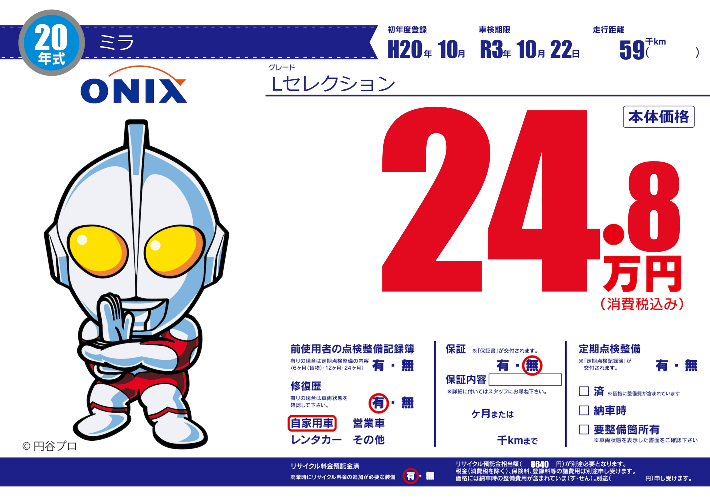 | 車名 | ミラ | グレード ミッション 排気量 |