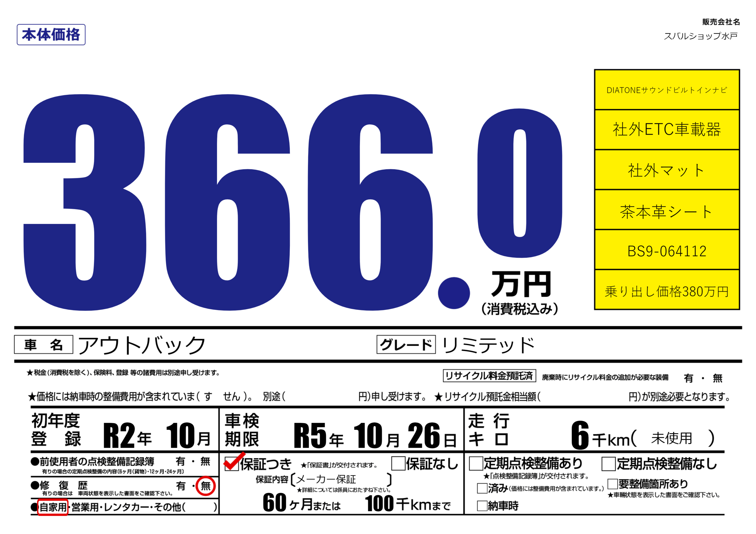 | 車名 | アウトバック | グレード ミッション 排気量 |