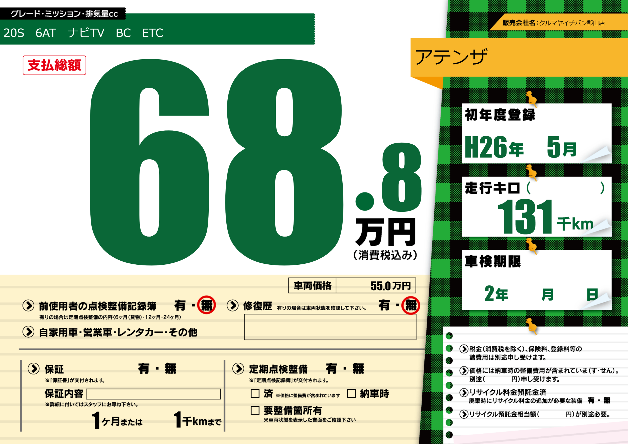 | 走行キロ | 13.1万km | 初年度登録 | H26年5月 |