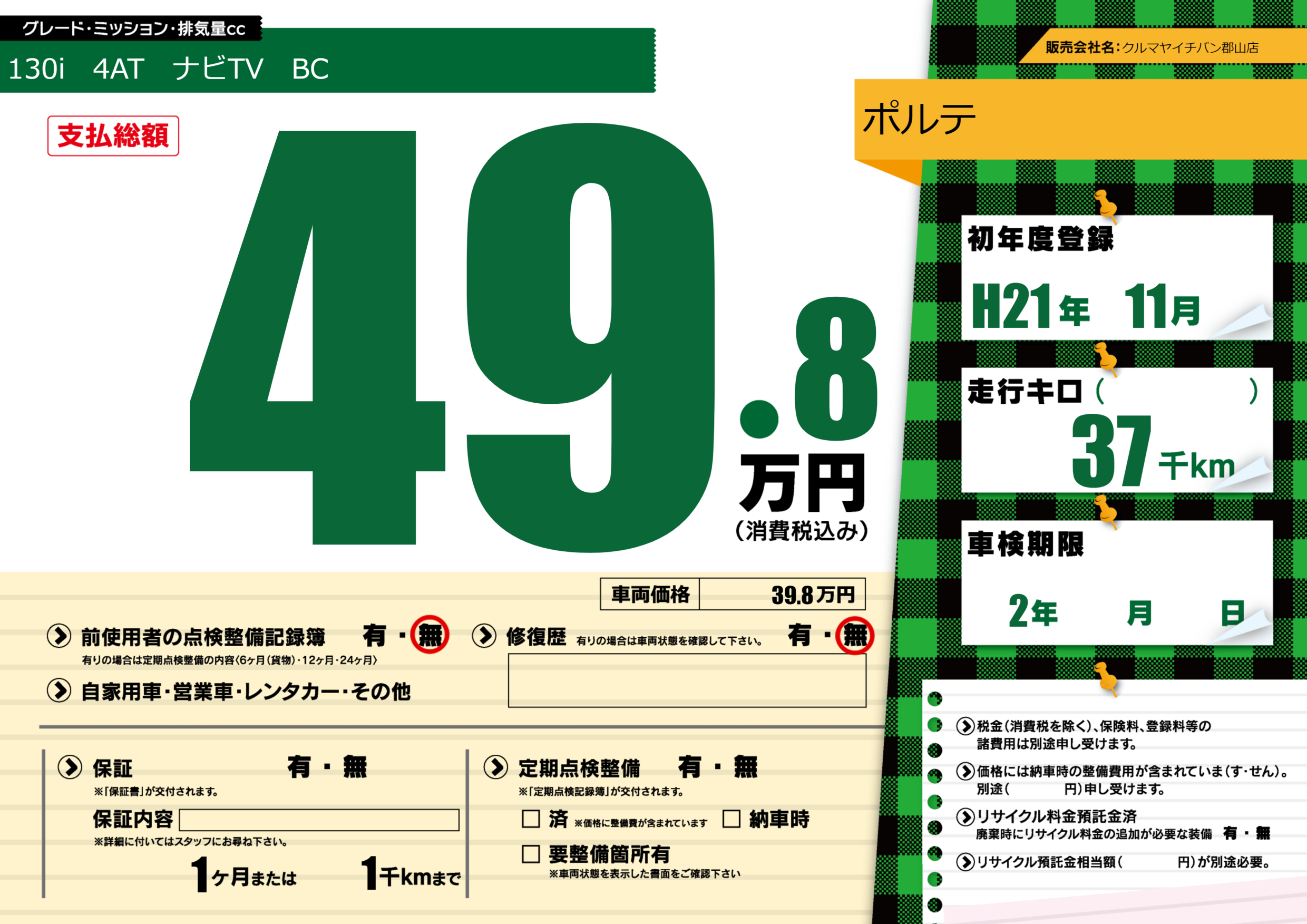 なし | 車検制限 | 2年---月---月 |