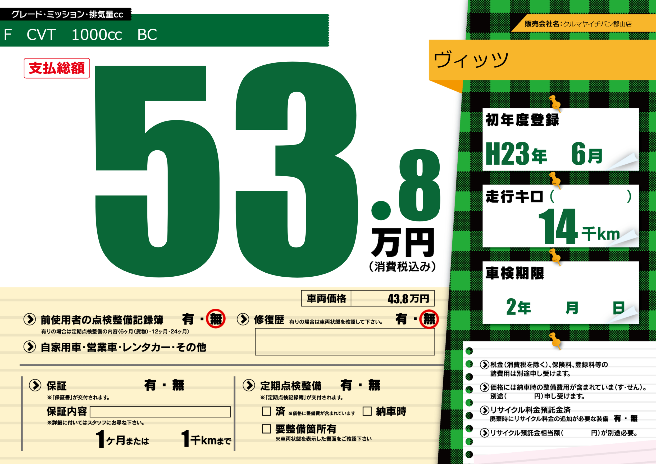 | 車名 | ヴィッツ | グレード ミッション 排気量 |