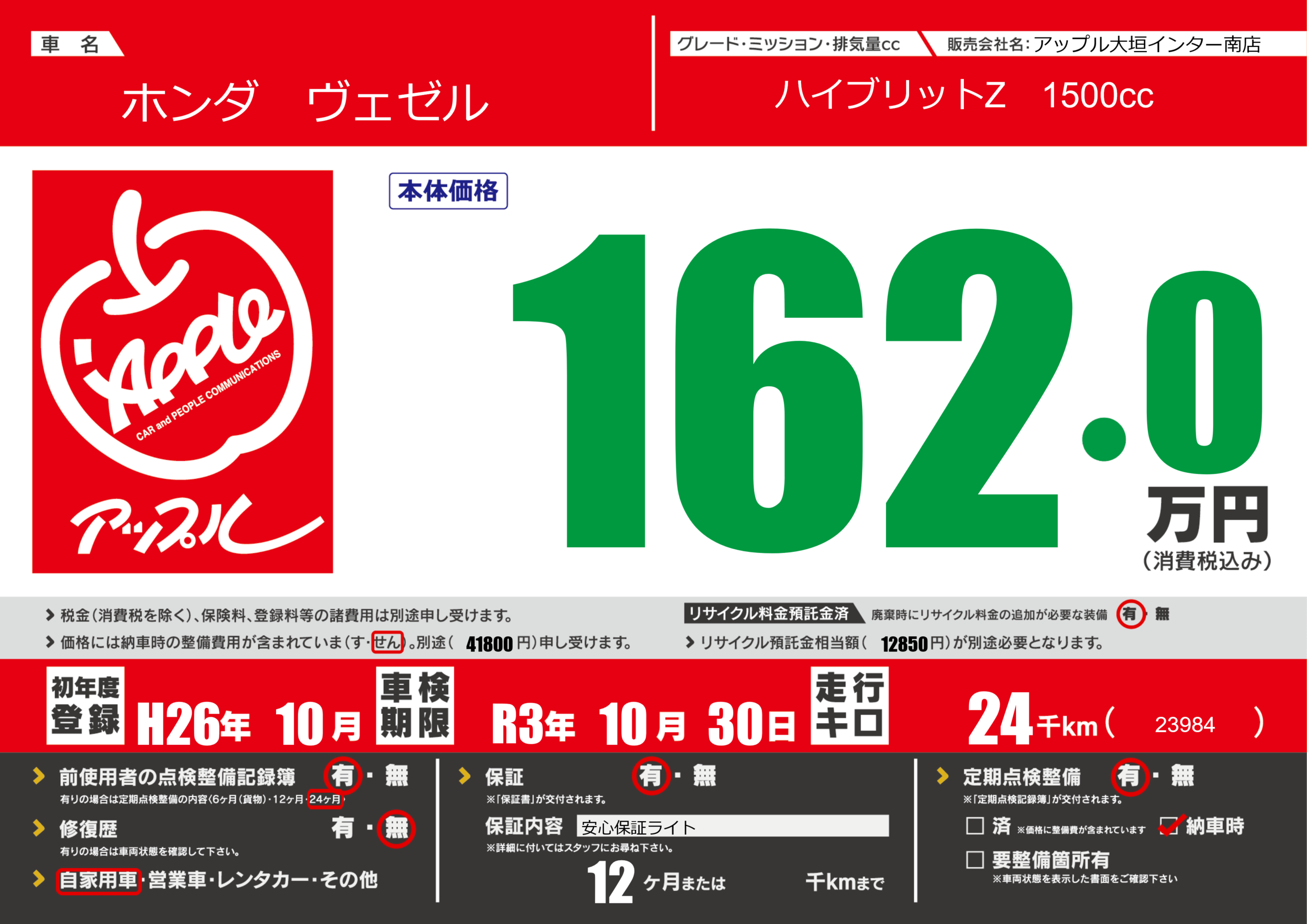 | 車名 | ホンダ ヴェゼル | グレード ミッション 排気量 |