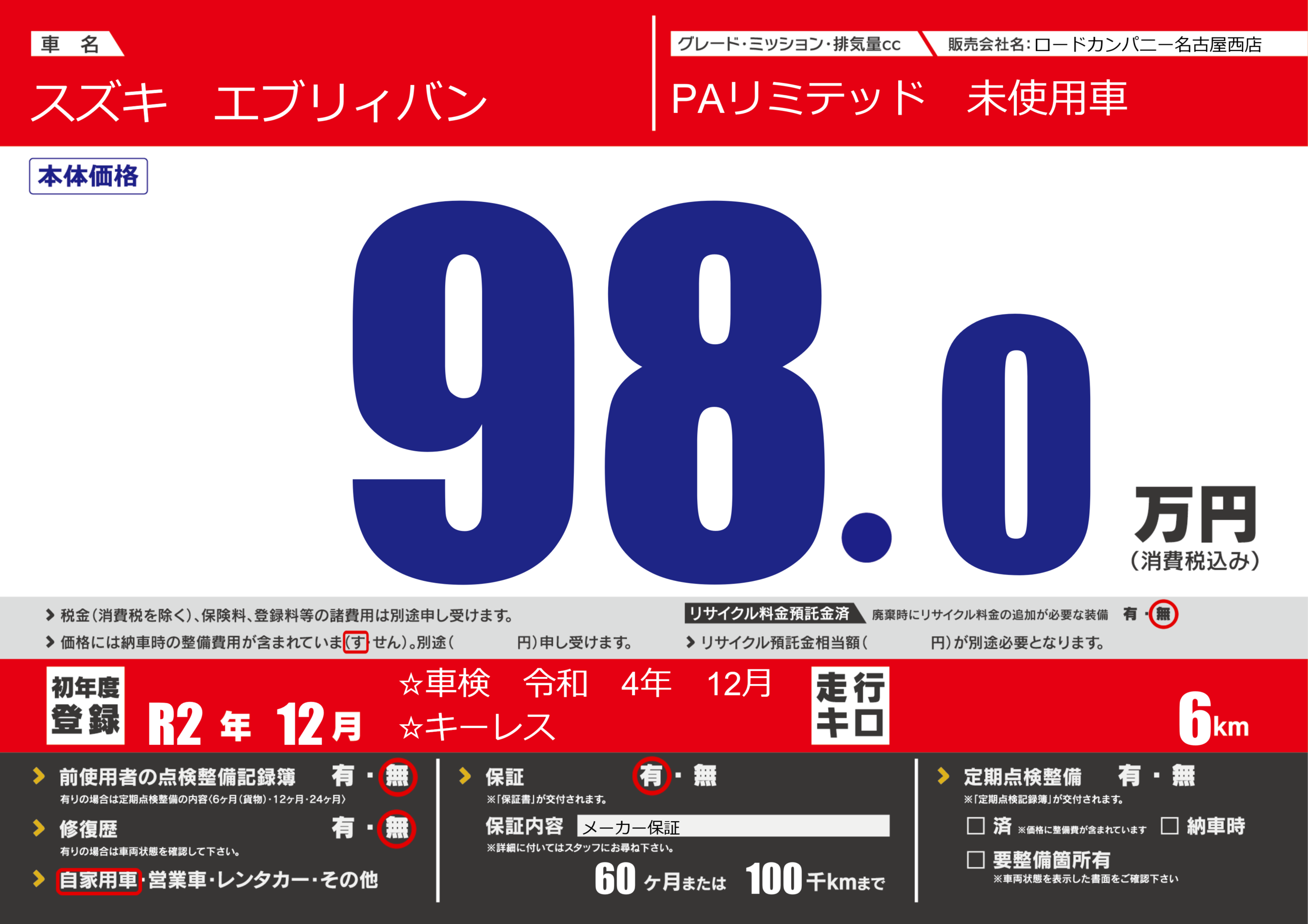| 走行キロ | 0.6万km | 初年度登録 | R2年12月 |